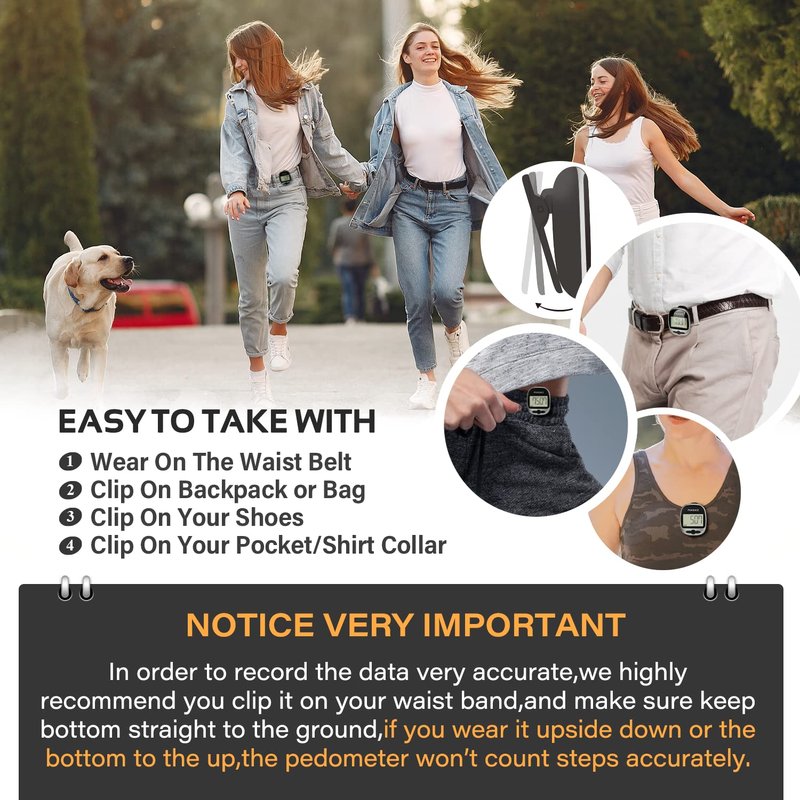 Attention :1.Please make sure when using it the pedometer is has the buttons facing the ground. If you clip it on you side ways or upside down it will not count anything.2.The paces are detected via the movement of the waist. For accurate reading, mount the unit closer to the center of the body.3.The principle of pedometer is to count by shaking, so there will be the gentle sound in the machine (the sound is very light, hanging in the body is not heard).4.Please gently pull out entire the white plastic tag before use.Make sure the tag won’t tear in a half when you pull it out !