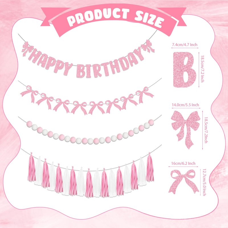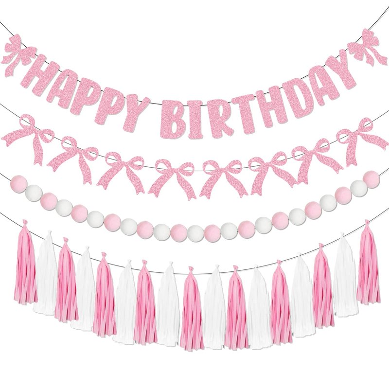- 【What You Will Get】No need to worry about tedious setup! This pink bow party decorations set includes 4 pre-strung garlands: 1 pink bow birthday banner, 1 pink bow garland, 1 pink bow garland, and 1 tassel banner. Enjoy effortless decorating and focus on the fun