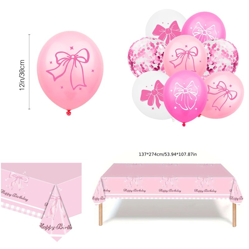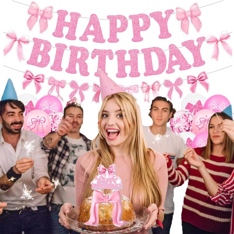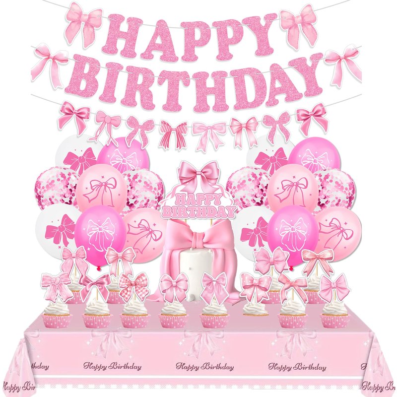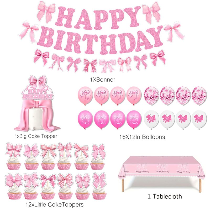 - PACKAGE INCLUDES: Pink bow glitter "HAPPY BIRTHDAY" banner garland, tablecover, 16pcs latex balloons (4 styles and 4pcs for each style); includes 4 pcs confetti balloons, cake topper, 12pcs cupcake toppers in different patterns. This pink bow happy birthday decor set will bring your party into a pink bow princess world immediately