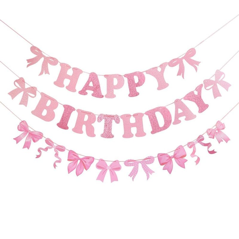 - Bow Banner Decorations: There are various pink bow style to form this bow garland. Happy birthday banner with glitter surface, which looks shinny and exquisite. another bow banner have different design, thicker or thinner style bow can built a dreamy sweetness bow space