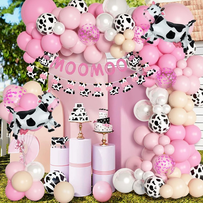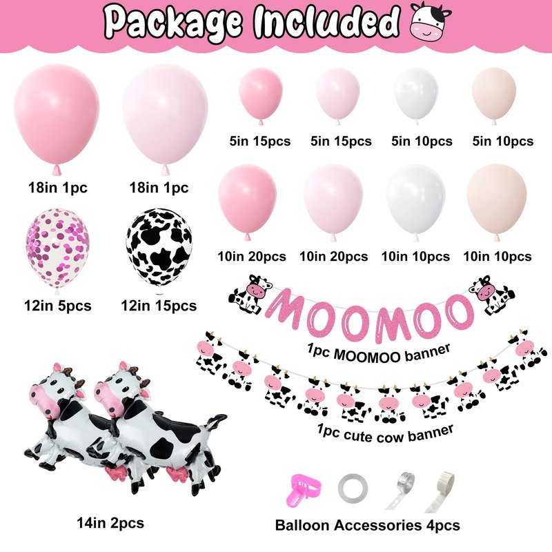 - Cow Balloon Arch: This valuable Cow party decoration kit includes 2pcs 18in balloons (pink/ macaroon pink), 5pcs 12in pink confetti balloons, 15pcs 12in cow print balloons, 60pcs 10in cowgirl balloons (pink/ macaroon pink/ cream/ pearl white), 60pcs 5in farm animal balloons (pink/ macaroon pink/ cream/ pearl white), 2pcs cow foil balloons, 1pc cow banner, 1pc MOOMOO banner, 4pcs balloon accessories.