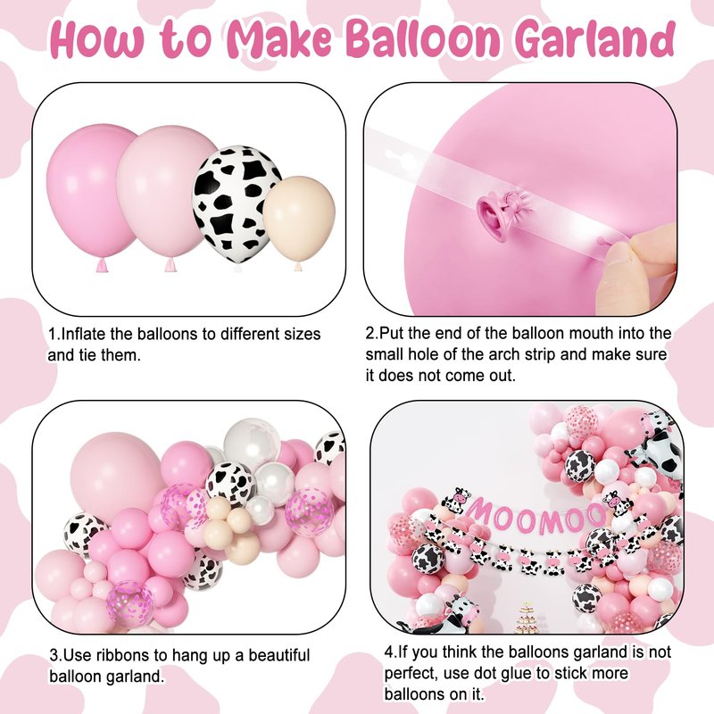 - Easy to Assemble: This is a DIY pink cow balloon arch. But it’s easy to assemble! We offer everything you need to create stunning cowgirl birthday decorations for your party! First, inflate these pink balloons and tie them with the knotter. Second, insert the cow balloons into the balloon strip and trim them to your desired length. Last, use the glue and ribbon to hang the cow balloon garland on the wall, over a door frame, on entryway, along the staircase and so forth.