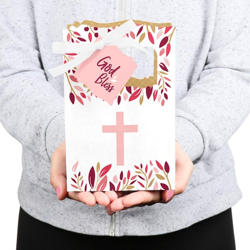 - Pink Elegant Cross Favor Boxes INCLUDES 12 religious party favor bags, 12 gift tags and coordinating satin ribbon. Classic favor boxes are a party must-have. Girl cross theme party supplies are great for a baptism, Christening, first communion, confirmation or baby dedication party.