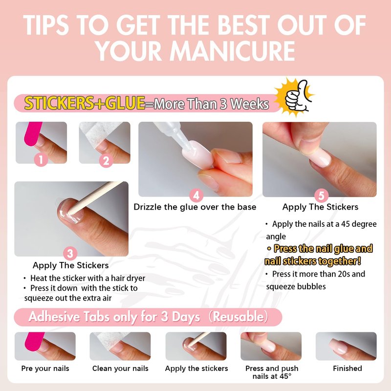 2.Please note that the nail glue is not included.If you want it last for a longer time,please use nail glue instead of the nail stickers.