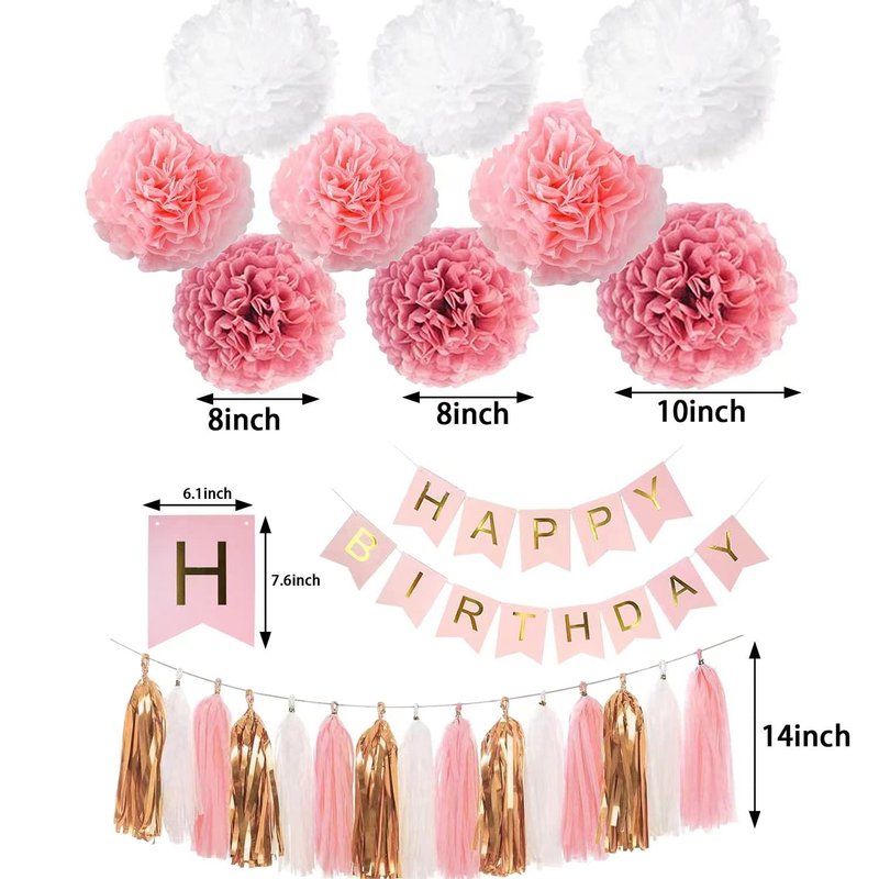 - Birthday Party Decorations Tit: No one would dislike our pink gold party decoration pack, which can add an Amazing Finishing to Your Birthday Party. In the kit you will find pompoms, a banner, a tassel garland