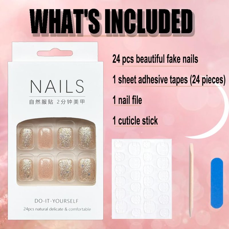Pink Press on Nails Short Square Champagne Gold Glitter Exquisite Design Fake Nails Chrome Acrylic Nails Press on Artificial Nails Stick on Nails Natural Nail Kits for Women and Girls 24Pcs