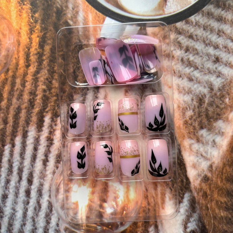 Pink Press on Nails Square Fake Nails Medium Length Glue on Nails Purple Pink False Nails with Black Leaf Glitter Design Gold Line Acrylic Press on Nails Cute Artificial Nails Glossy Stick on Nails