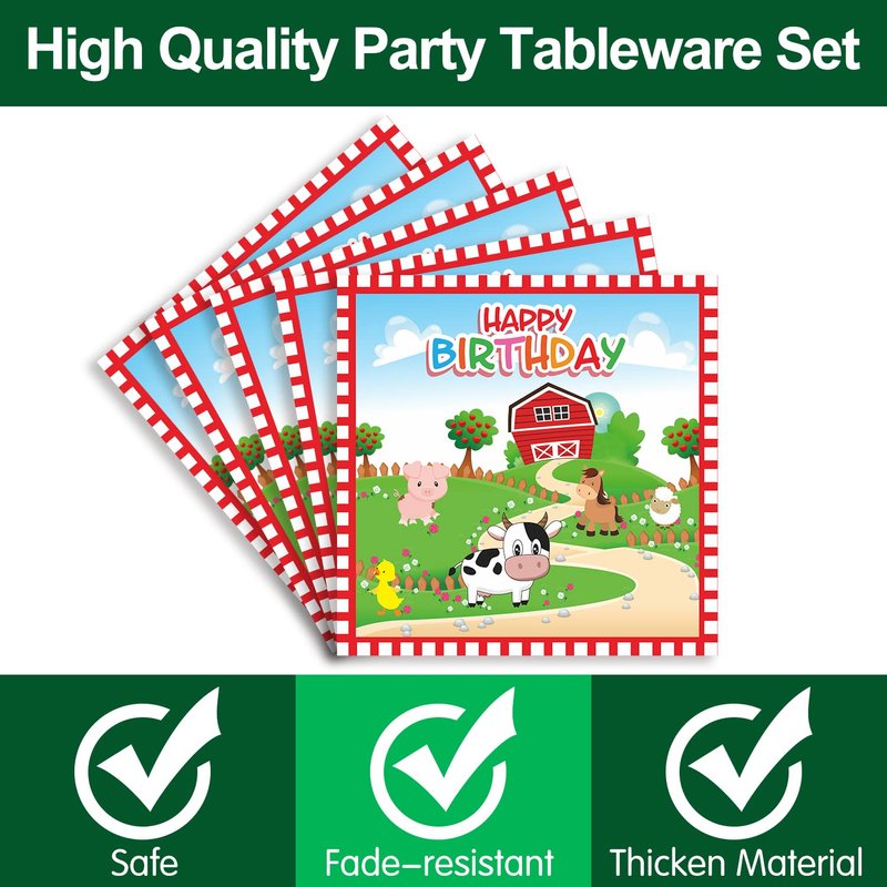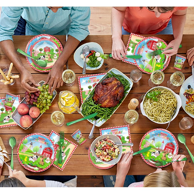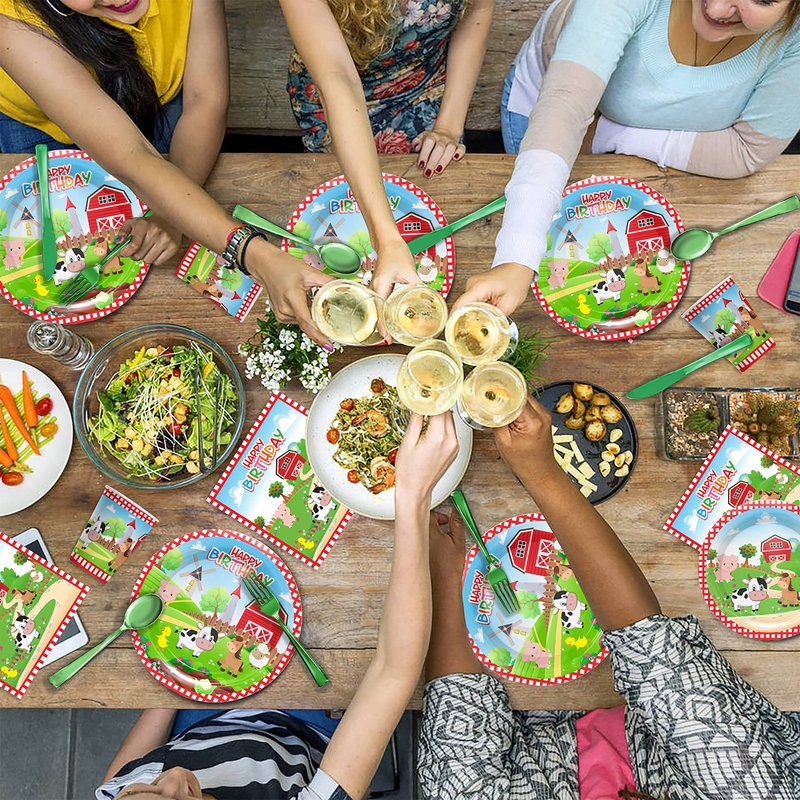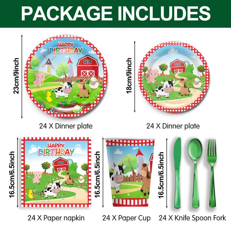 - Barnyard Animals Party Tableware: This Farm House theme birthday tableware set includes 24pcs 9'' dinner paper plates, 24pcs 7'' dessert paper plates, 24pcs napkins, 24pcs cups, 24pcs forks, 24pcs spoons, 24pcs knifees, for Barnyard Animals birthday party supplies