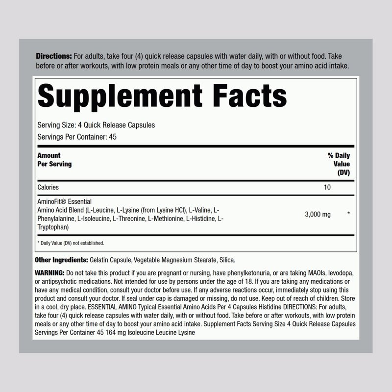 Fitness Lab's Essential Amino Acid (EAA) supplement features 3,000 mg of an Essential Amino Acid Blend per serving. This includes L-Leucine, L-Lysine, L-Valine, L-Phenylalanine, L-Threonine, L-Methionine and more, all in quick release capsules. At Piping Rock we test our ingredients for purity and potency, always ensuring exceptional quality for your pre and post workout routine.
