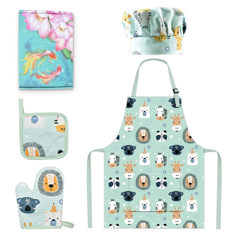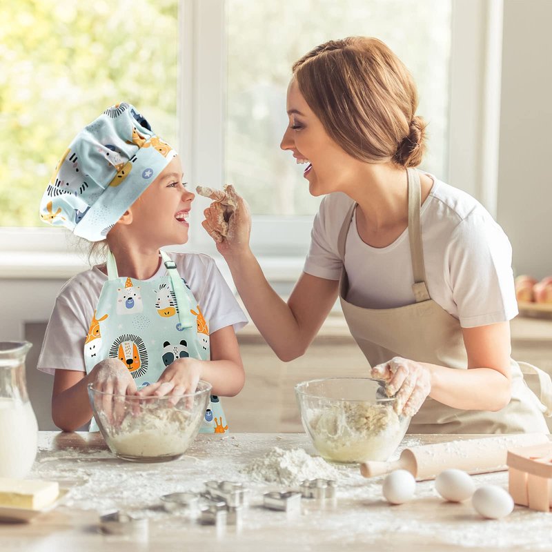 - LOVELY ANIMAL PATTERNS: Printed with cute cartoon patterns, this children apron and chef hat set will offer kids a lot of fun when used, no shrinking or color fading. Easy to clean and can be used multiple times