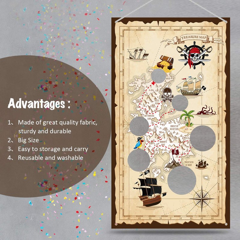 - Package includes: 1 fabric pirate toss game banner, 3 bean bags and 1 ribbon (approx.4 m/ 13.12 ft) for hanging; Funny treasure map themed party game set for both children and adults