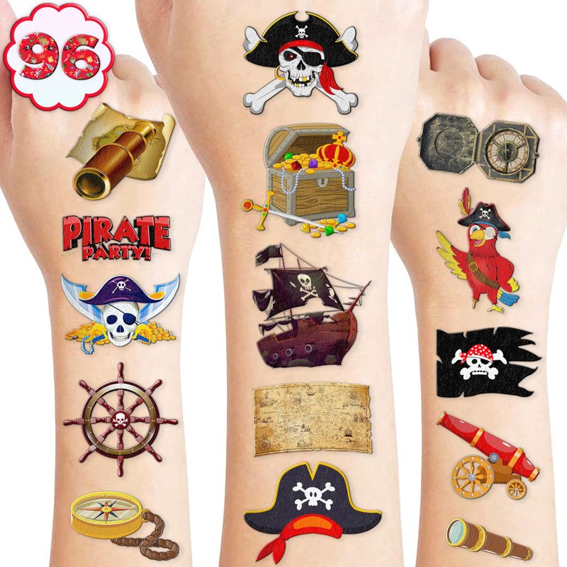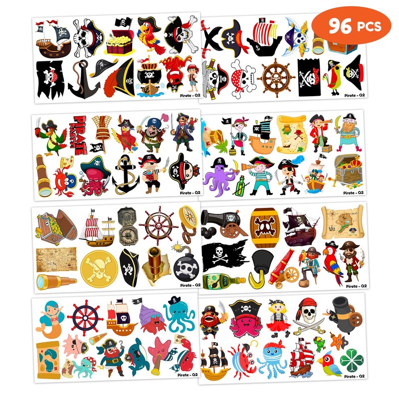 Pirate Temporary Tattoos Birthday Themed Party Supplies Decorations Favors 8 Sheets 96PCS Decor Cute Stickers Tattoos for Class School Prizes Gift for Kids Boys Girls Carnival Christmas Rewards
