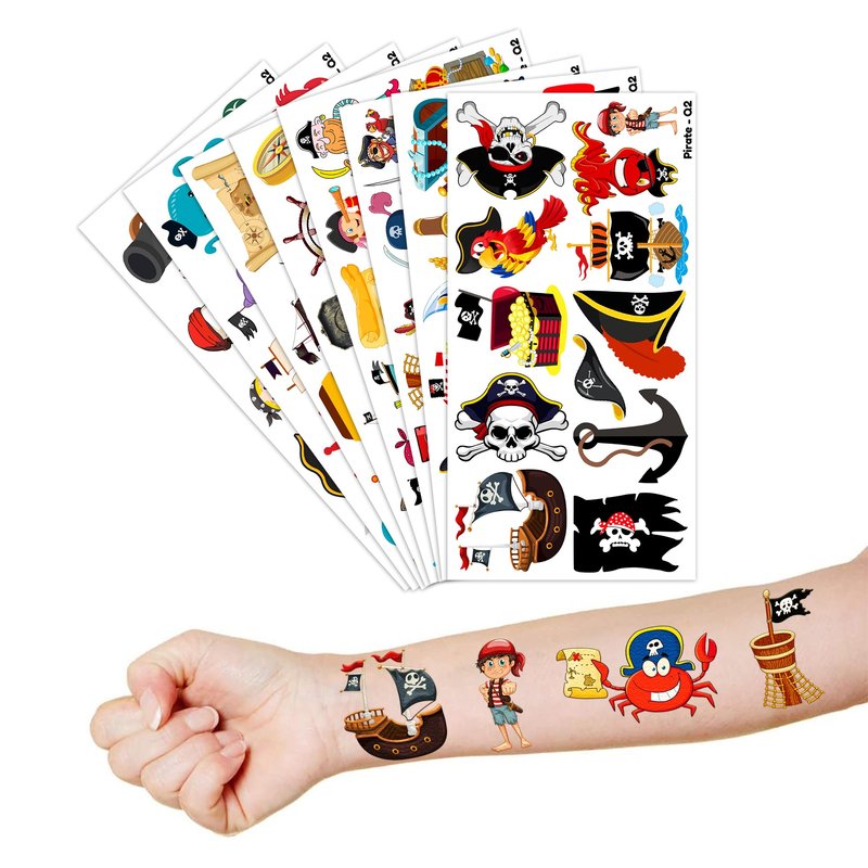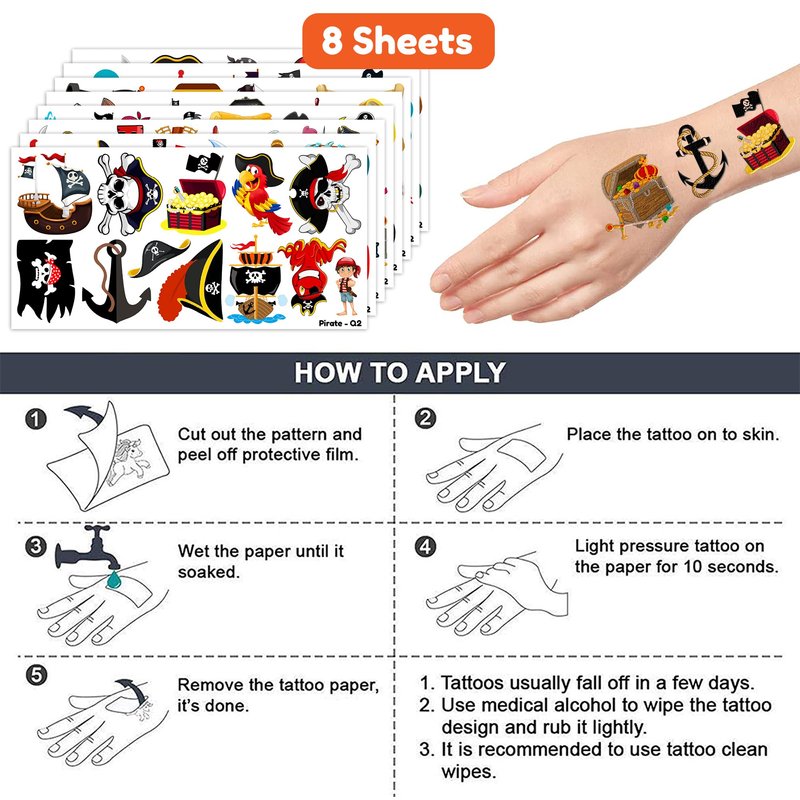 【The Perfect Pirate Theme Party Gift】8 Sheets Pirate tattoos stickers, each pattern measures 6.1 * 3.1 inch , one size fit all adult and kids. One of the most popular party themes for children, make the best party gifts for your children & Carnival gifts, help your children become small heroes at the party! Bring nonstop joy to the whole party! Make your kids receive full of expectation and exploration in every festival. 【Cute patterns】Pirate Temporary tattoos stickers, features an assortment of themed characters, colors are bright, and designs are adorable, which are attractive to children. 【Various Tattoo Set】Our party favors are based on children's happiness both in appearance and inwardness. Use our party favors can bring joy to your baby, birthday gifts, Christmas sock stuff, family party prize, treasure boxes, Carnival prizes, Classroom rewards, etc. Cute and lively temporary tattoo's element can be used for laptops, backpacks, desks, suitcases, books, water cups and other things you can see everywhere to bring visual enjoyment. 🌴【How to Use】This sticker is easy to use. Just dip a small amount of water to wet the sticker, place it with the back down, and then press it for about 15 seconds to remove it. These delicate stickers are usually retained all days and can be cleaned with baby oil, alcohol or hand sanitizer. Should not be used for children under 3 years old, people with a history of sensitive skin. We all recommend using a small part to use the test first, and if there is no problem, it can be used normally. 【Satisfactory Service】Our goal is to make customers satisfied. If you have any questions, please contact us. We will try our best to help you solve the problem and ensure that you have the best shopping experience.