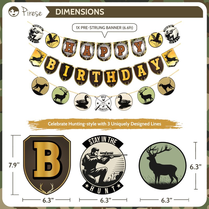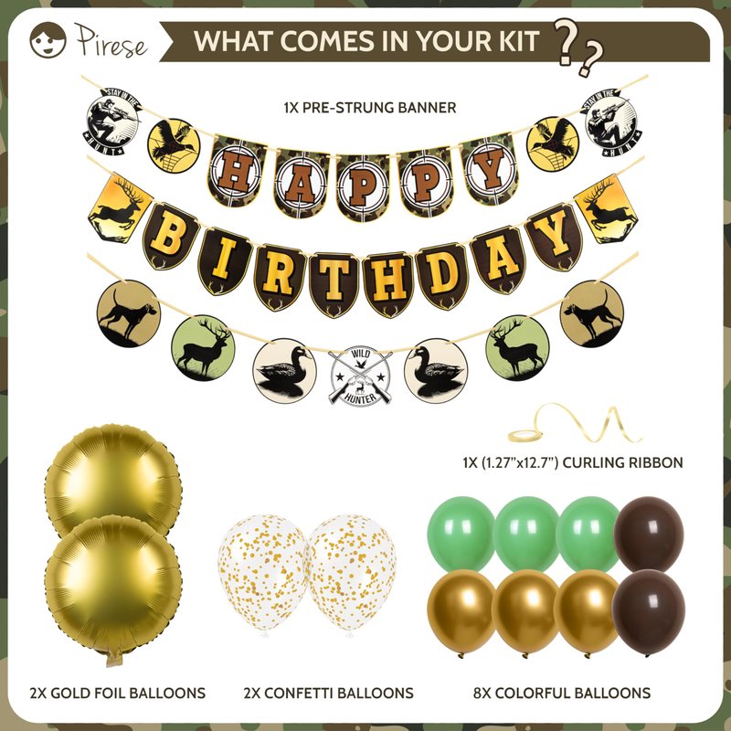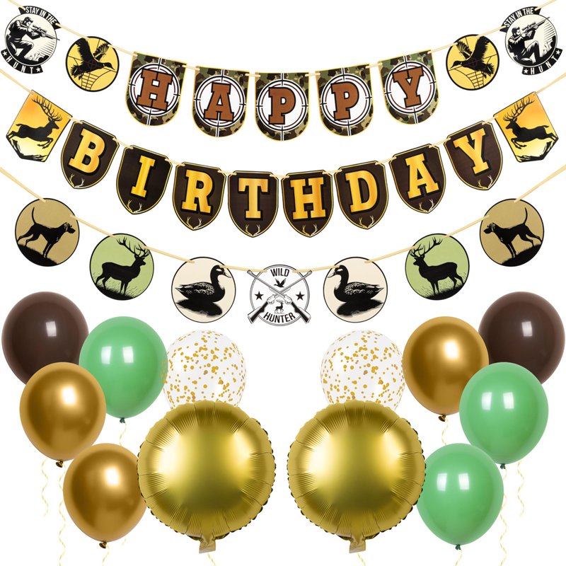 - EPIC DESIGN MEETS WILD FUN! Gear up with our Hunting Birthday Party Supplies featuring a unique 6.6ft banner that’s already strung for action, 8x colorful hunting balloons 12", to pop the party off, 2x confetti balloons 12", and 2x gold foil balloons 18" that shine as bright as your hunter's smile!