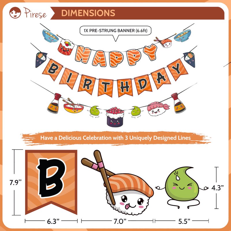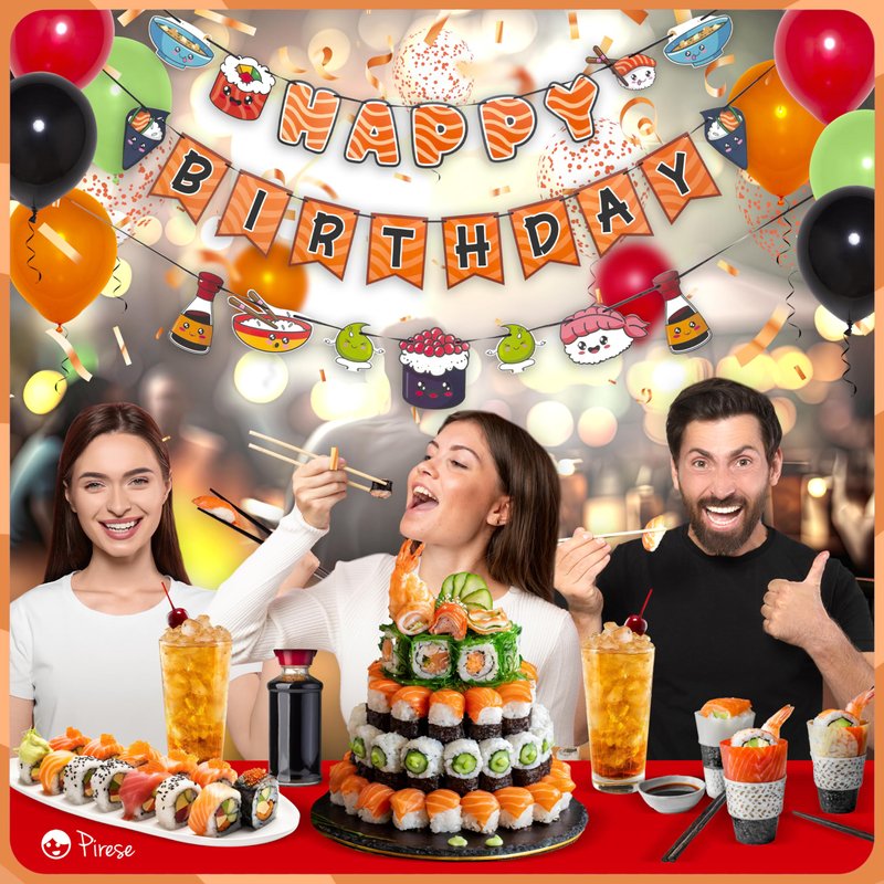 - All-in-One Kit, Exclusive Design: Celebrate a tasty sushi party! Our birthday decoration kit includes a Sushi Happy Birthday Banner 6.6ft, 8x colorful latex balloons 12" and 4x confetti balloons 12".