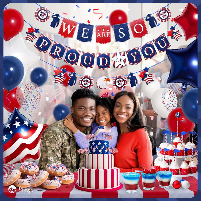 - SALUTE TO THE BRAVE - Pirese's We Are So Proud of You Banner is an exclusive salute in every stitch. Crafted for those who've honored the call of duty, it's perfect for military farewells, welcome homes, appreciation decorations, and every patriotic festivity in between.