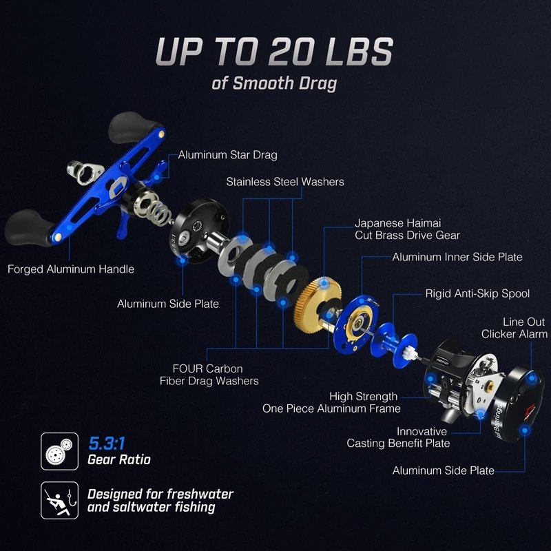 • Powerful: The Premium Carbon Fiber Drag System paired with a Japanese Haimai-Cut brass main gear provides up to 22 pounds of stopping power to stop trophy fish in their tracks