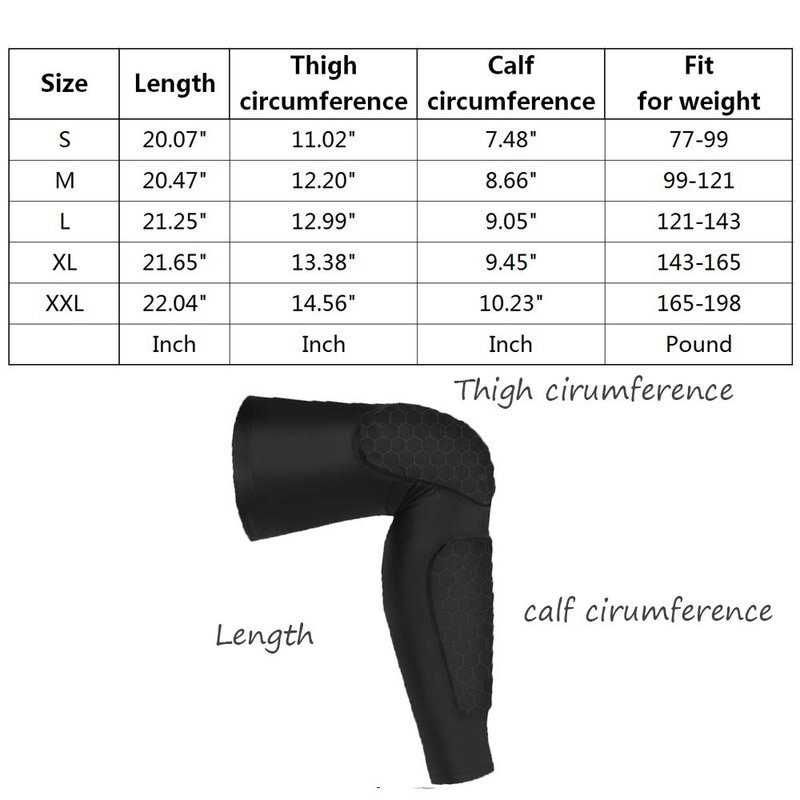 100% Brand new and high quality! New design . Nice workmanship, Double protection of knee and leg,with honeycomb pad design to protect leg from crash, as well with anti slip band, no easy to fall off. The fabric is breathable and elastic, the sweat can be expeled from the breathable fabric. Well portect muscles from pulling during in outdoor activities such as basketball, football, cycling, golf, baseball... You will not be disappointed. Color: Black Material: high quality soft & elastic polyester fabric Size: S,M, L, XL,XXL Package:2 * knee pads Size Thigh circumference Calf circumference Length