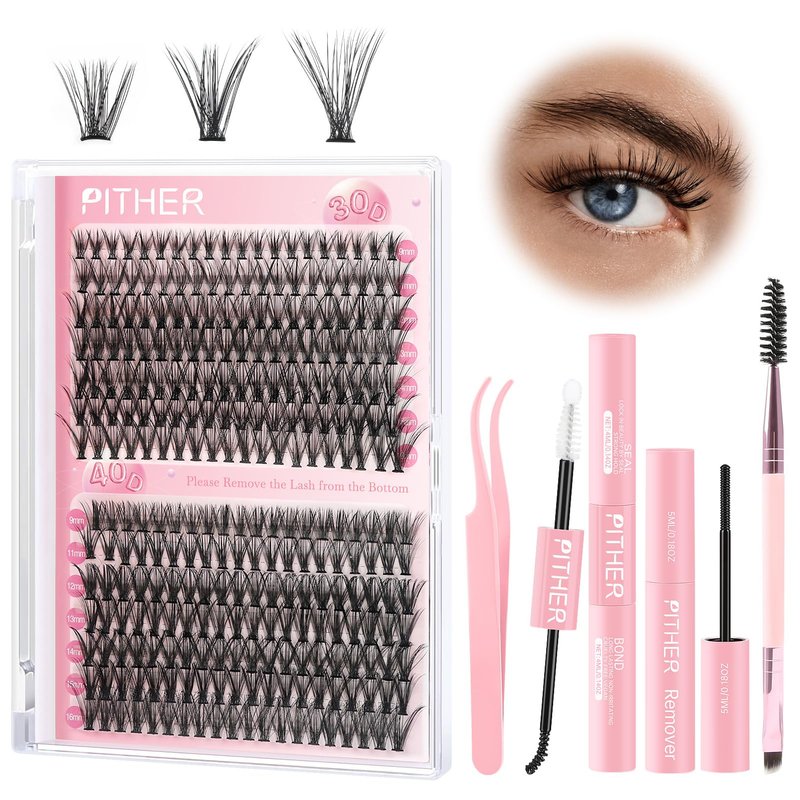 PITHER DIY Lash Extension Kit, Eyelash Extension Kit 280PCS 30D 40D Mix 9-16mm Individual Lash Clusters Kit with Applicator Bond and Seal Lash Glue Lash Extension Remover Tweezer