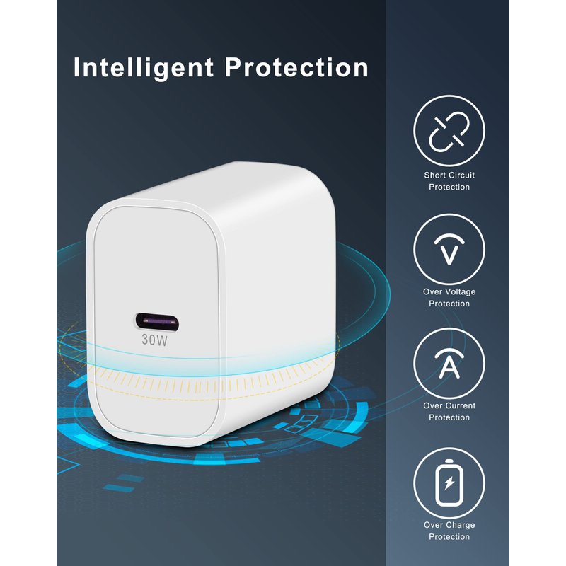 - Safe Charging: The 30W USB C charger built in smart IC chip, automatically matches the current required by the device. Equipped with multiple safety protection systems to prevent over-voltage, over-charging, over-heating and short-circuit to keep connected devices safe