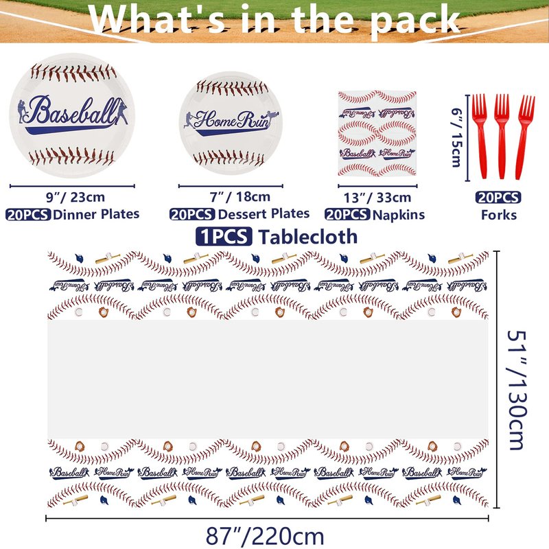 - What Will You Get: Our baseball birthday decorations and tableware included 40 pcs plates(20 dinner plates, 9"/23cm; 20 dessert plates, 7"/18cm), 20 pcs party napkins, 1 pc baseball tablecloth(51x87"/130x220cm),20 pcs red forks.