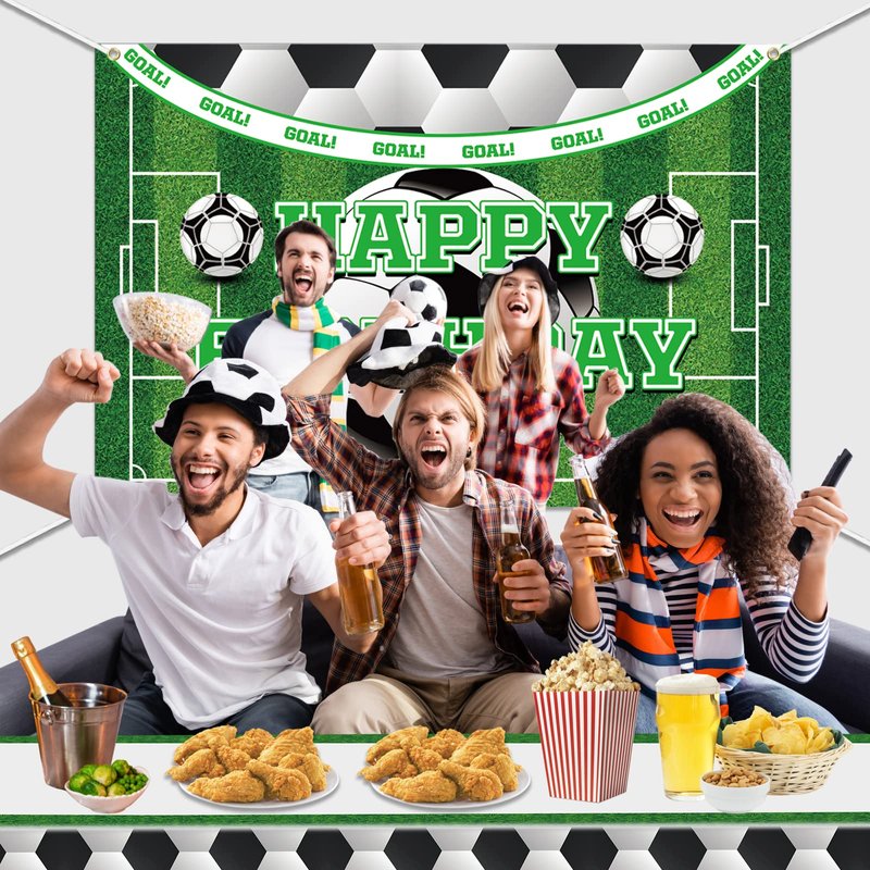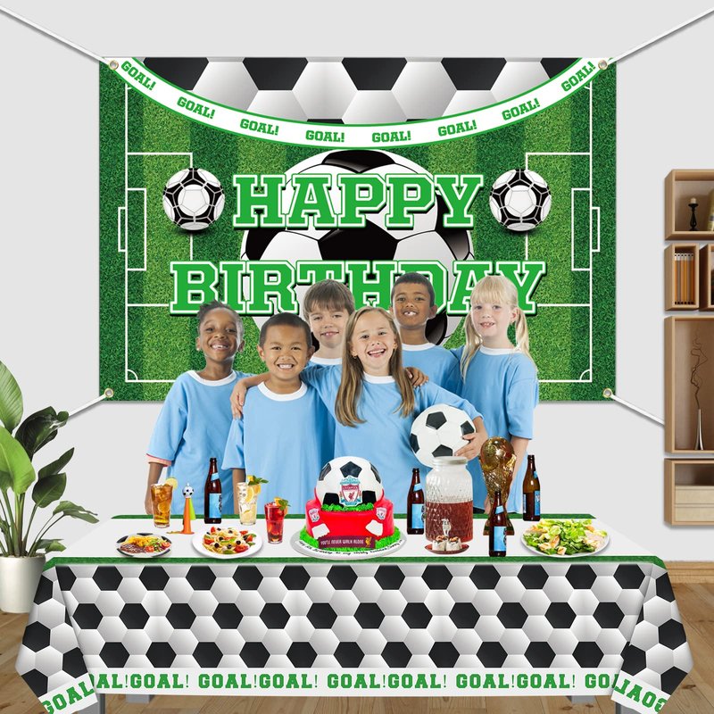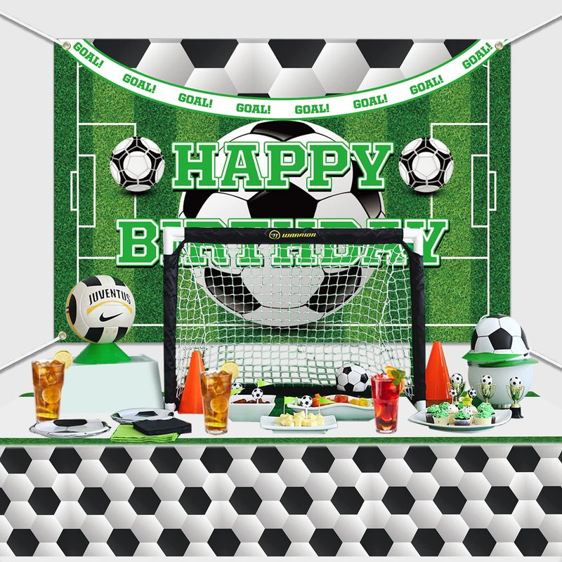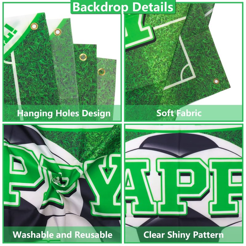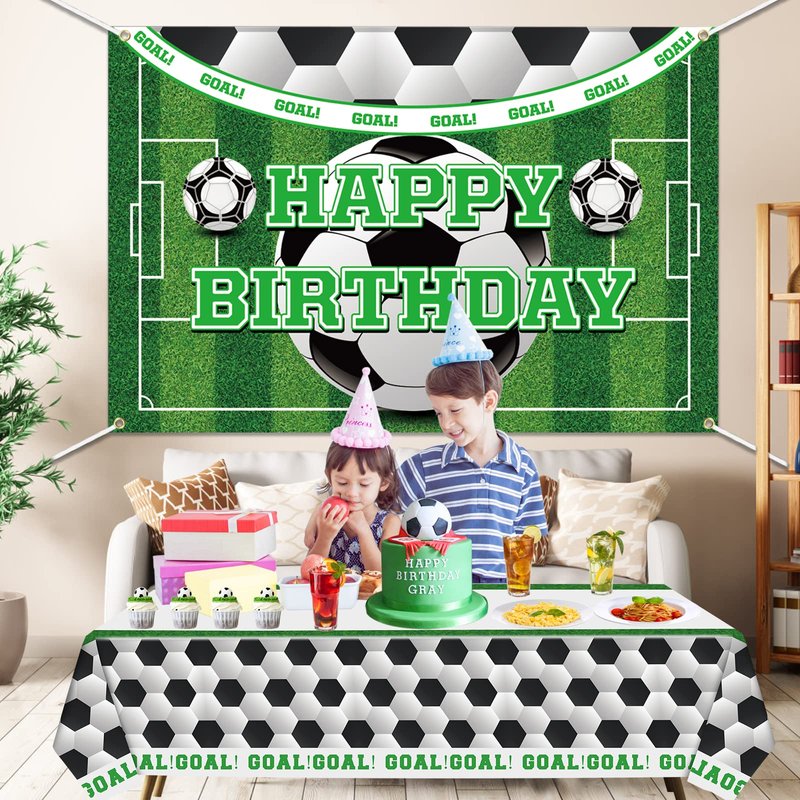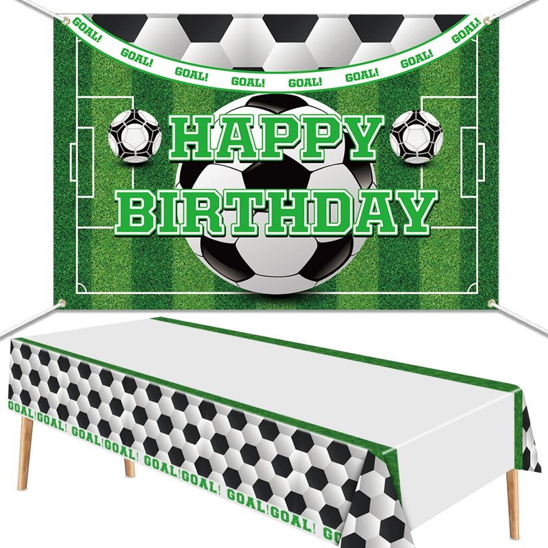 - Great soccer Birthday Party Supplies: Available to hang the backdrop at the entrance of birthday party, living room, house outside wall, place the tablecloth on your dessert table, dining table. The cute combo makes it easy to create a memorable and impressive experience.