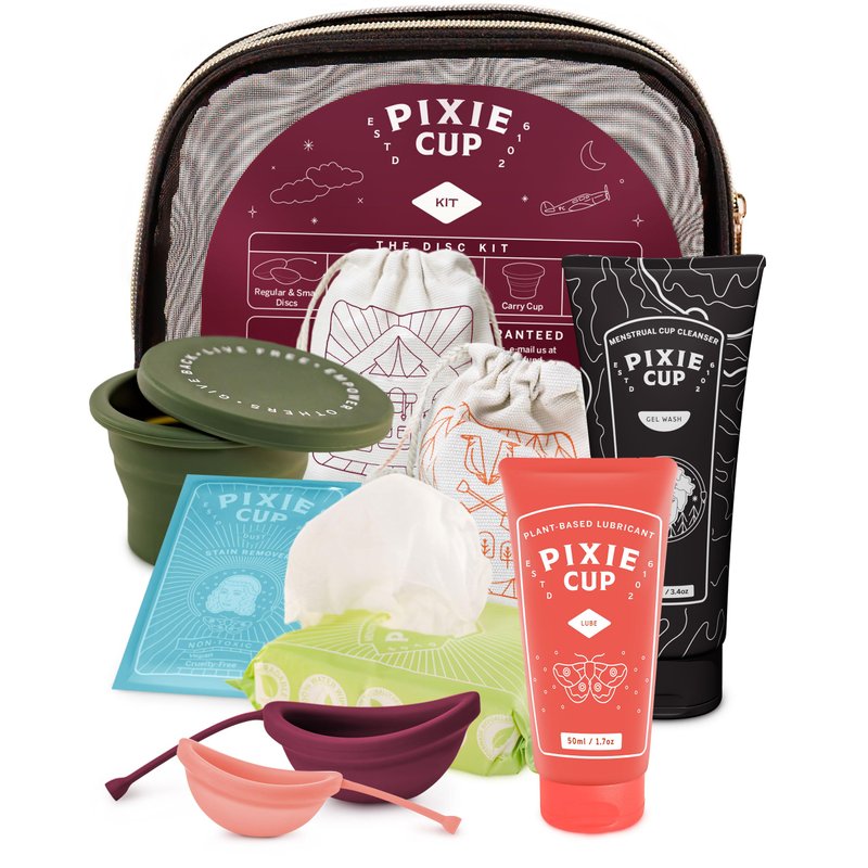 - All-Inclusive. Our disc kit contains our Small Pixie Disc, Large Pixie Disc, Pixie Lube, Pixie Wash, Pixie Sterilizing Carry Cup, and Pixie Wipes in a bag. The perfect gift for any woman in your life!
