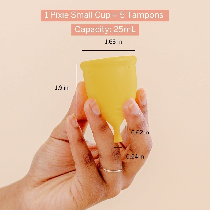 - Period Freedom. Pixie is a reusable silicone cup that collects your monthly discharge or menstrual flow. Inserted similar to a tampon, Pixie Cup sits in the vaginal canal comfortably with no odor, leaks or risk of TSS. Easy removal and leak-free periods means no period blood stains! Also works as a conception cup!