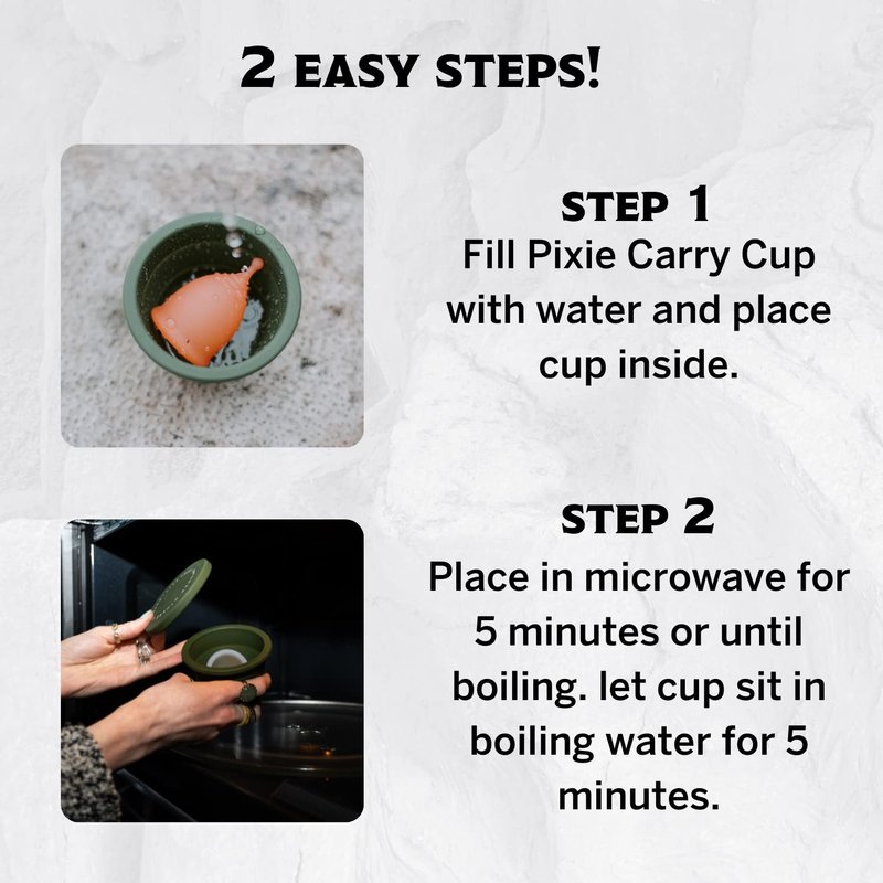 - Microwaveable. Gone are the days of boiling your menstrual cup/disc in a pot on the kitchen stove! Pixie Cup Sterilizing Container is perfect for shared living situations such as a dorm or apartment.