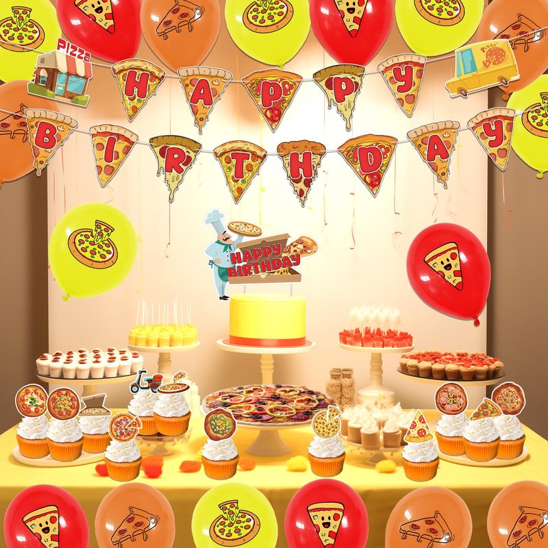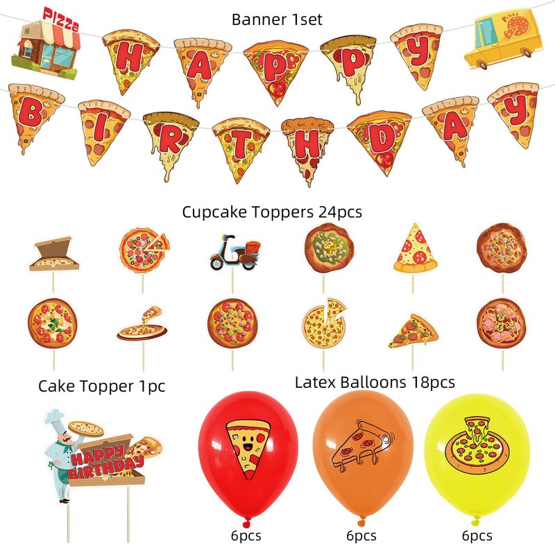 - 🧀【High-Quality Materials】The pizza birthday banners and small cupcake toppers are made of high-quality cardstock, making it safe for food decor. The pizza-themed balloons are made from thickened latex material, ensuring they are safe, durable, and never easy to burst.