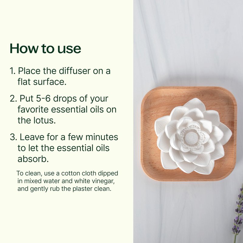 Elevate your home with the soothing essence of our Passive Lotus Diffuser. Experience cost-effective and decorative passive diffusion, seamlessly bringing your favorite essential oils to any room. The exquisite lotus-shaped top, paired with a natural beech wood base, adds a touch of tranquility to your home or office. The chic lotus flower top is intentionally porous and unglazed, allowing it to absorb essential oils and delicately scent the air within a 160-foot radius—no heat or electricity required. Immerse yourself in the therapeutic benefits by simply applying 5-6 drops of your preferred essential oil or blend directly to the flower. Embrace the gentle and continuous diffusion that creates a serene atmosphere in your living space. With our Passive Lotus Diffuser, you are not only bringing nature indoors but also enjoying a decorative piece that complements any setting. Transform your space with the power of aromatherapy and the elegance of the lotus. Please note that due to the diffuser's porous nature, it's normal for oils to discolor the flower. When selecting oils, consider this characteristic and choose an appropriate location for oil drops. To maintain the diffuser's charm, clean it with a cotton cloth dipped in a mixture of water and white vinegar, gently rubbing away any residue.