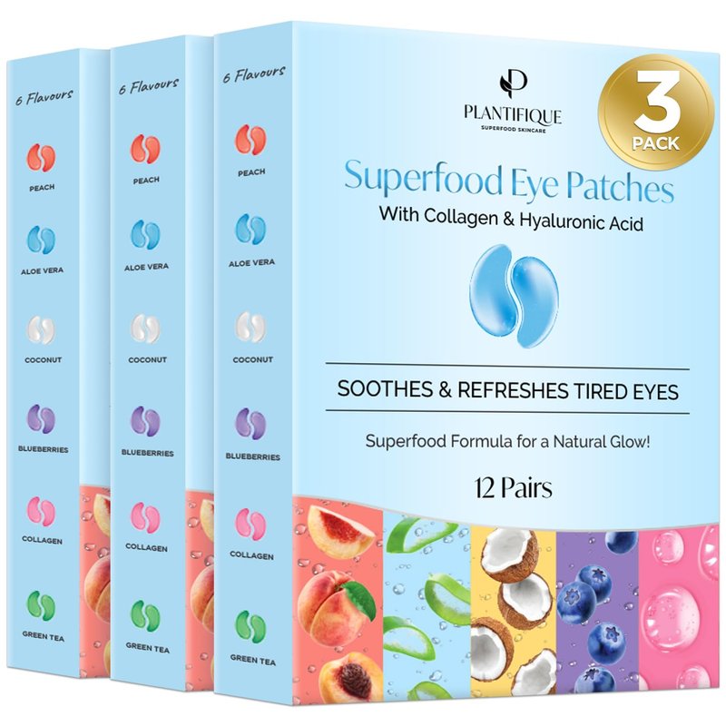 Elevate your skincare routine with Plantifique Superfood Eye Patches, your go-to solution for rejuvenated and refreshed under-eye skin. Our innovative formula harnesses the power of nature's finest superfoods to target common concerns like puffiness, dark circles, fine lines, and dryness. Why Superfoods? We believe in the potency of superfoods to deliver remarkable skincare results. Our eye patches are infused with a curated selection of nutrient-rich superfoods, including Green Tea Extract, Collagen & Flaxseeds, Peach, Coconut, Aloe Vera, Hyaluronic Acid, and Blueberries. Each ingredient is carefully chosen for its unique benefits, ensuring a comprehensive solution to under-eye care. Benefits: Detoxifies and Depuffs: Green tea extract, rich in antioxidants, works to detoxify and depuff the delicate under-eye area, soothing any irritation and revitalizing tired skin. Improves Fine Lines: Collagen and flaxseeds promote collagen production, enhancing firmness and reducing the appearance of fine lines and wrinkles for a smoother, more youthful look. Brightens Tired Eyes: Peach extract, packed with vitamins A and C, brightens the skin tone and gently exfoliates, revealing a fresher complexion and diminishing the appearance of dark circles. Moisturizes and Nourishes: Coconut extract, with its nourishing fatty acids, deeply hydrates the skin, preventing the formation of fine lines and maintaining a supple texture. Hydrate Instantly: Aloe vera and hyaluronic acid team up to provide instant hydration, plumping the skin and improving moisture balance for a rejuvenated appearance. Enhance the Skin’s Glow: Blueberries, abundant in antioxidants, boost skin elasticity by neutralizing free radicals, promoting a radiant and youthful complexion. Experience the Difference: Our Superfood Eye Patches are not just a quick fix; they offer a holistic approach to under-eye care. Each pack contains 6 different flavors, each infused with special superfoods to cater to your specific skincare needs. Elevate your beauty regimen and unveil revitalized, luminous eyes with Plantifique Superfood Eye Patches.