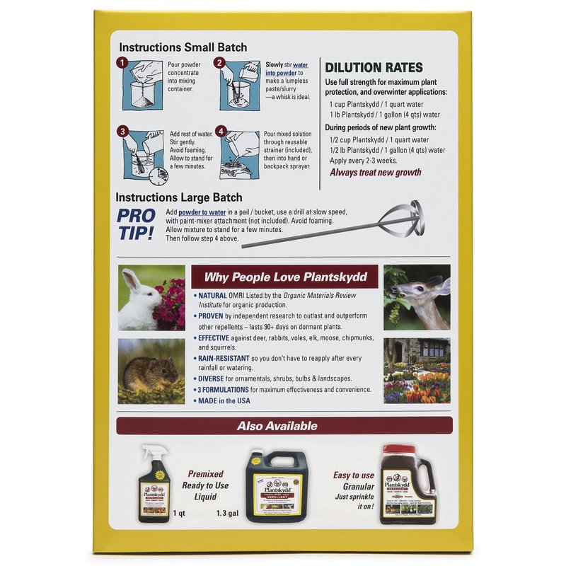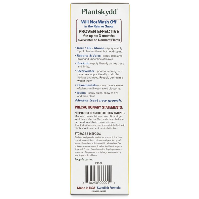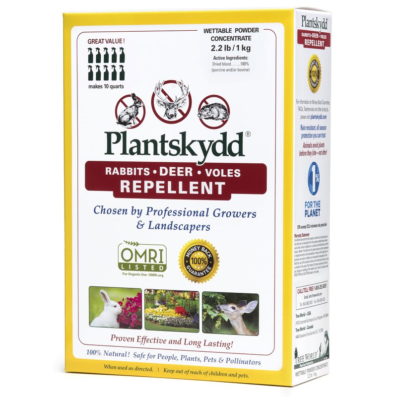 Plantskydd's 2.2-pound wettable powder mixes to make 2.5 gallons of liquid product. Plantskydd has been proven effective for year-round control of deer, rabbits, elk, moose, hares, voles, squirrels, chipmunks, and other herbivores. Plantskydd works on flowers, perennials, shrubs, trees, and bulbs. Rain resistant in 24 hours after spraying. Protects over 900 plants 1 ft high. During the growing season, apply every 2-4 weeks. During dormant or winter months, apply every 3 months (will last up to 6 months). Active ingredient: Dried Blood 100% (porcine and/or bovine). Wettable Powder will last 5 years in its original package. Tightly re-seal unused powder and store it in a cool, dry, dark location. Keep from freezing. Keep out of the reach of children and pets. OMRI listed for organic use. Plantskydd was originally developed for commercial forest planting in Sweden, now produced in the USA. Plantskydd also acts as a foliage feed fertilizer on many plants. Made in the USA.