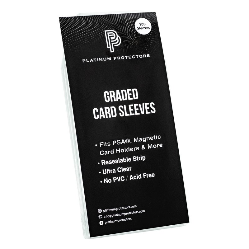 Platinum Protectors resealable graded card sleeves are for the serious card collector. The perfect way to keep your PSA, CGC and TAG graded card slabs clean and scratch free. Ultra-clear transparency with no imperfections. Great way to add more protection to your graded cards. Resealable adhesive opening allows for easy insertion/removal of your graded cards. *Card(s) not included, for display purposes only