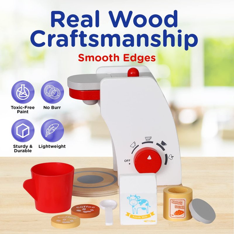 Days have never been more fun with this wooden play kitchen set. These refined toy kitchen accessories will launch your little one's imagination with its flip-top structure for coffee pods loading and its turning knob for its pretend settings.