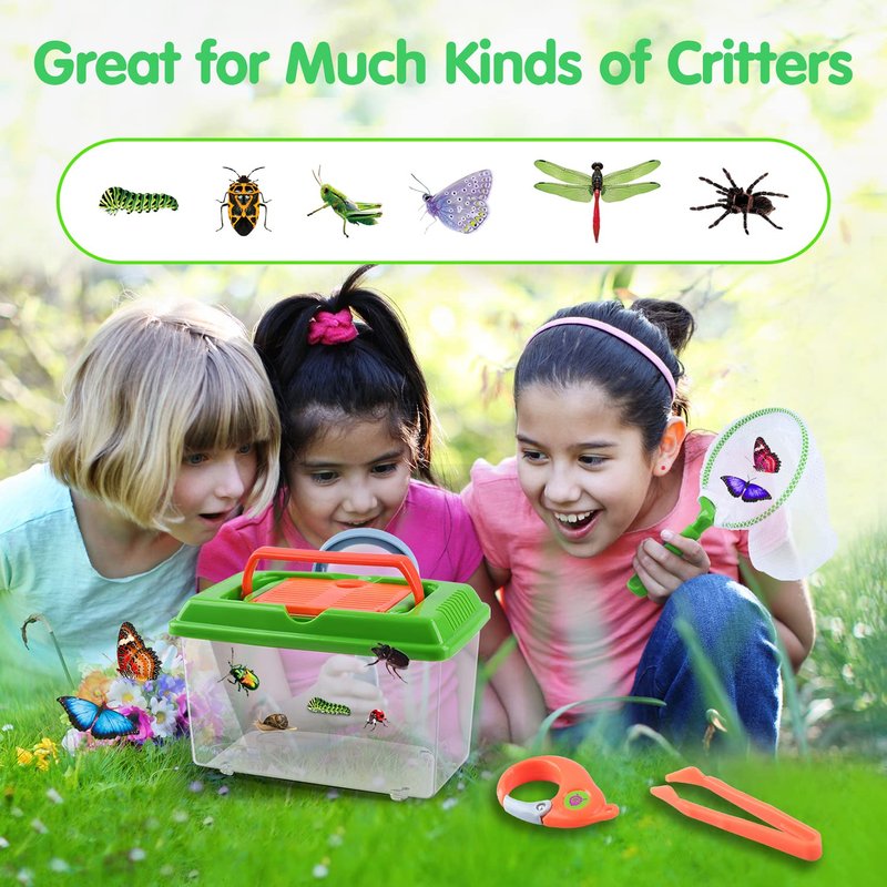 - Eucational Science Toy for Kids:The outdoor explorer toys for 3+ year old boys will have an enjoyable learning experience using this butterfly habitat kit and bug catching kit for kids. Kids can use the butterfly net to catch butterflies,use the tweezer to transport it to the habita case,and use the magnifying glass to observe and learn about the different types of butterflies, bugs, critters, and insects out there.Great outdoor toys for kids ages 8-12.