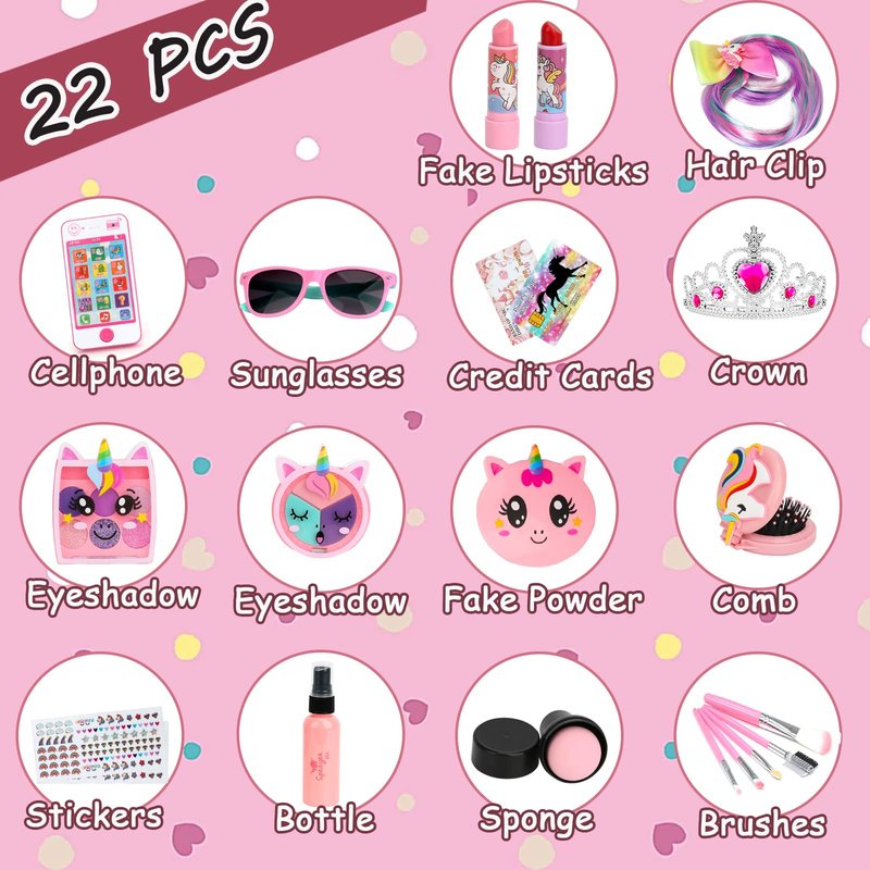 - TODDLERS PURSE SET WITH ACCESSORIES - 22PCS: Kids Toy Phone, kids sunglasses toy, Kids Credit Cards *2, Princess Crown, Hair Clip, Plastic Lipsticks *2, Fake Eyeshadow *2, Fake Powder, Folding Comb, Kids Stickers *2, Bottle, Sponge, Makeup Brushes *5, Little Girls Purse.