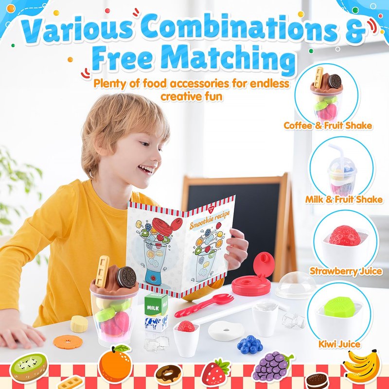 - 27 Pcs Toy Kitchen Appliance Set: Our toy blender set includes a blender, cup lid, coffee foam, cream foam, milk box, 5 kinds of food fruits, sandwich biscuits, cookies and 2 ice cubes, which can satisfy children to make fruit smoothies of various flavors. In addition, there is also a menu card, 2 cups, straws and spoons, let your child engage in imaginative role-playing with friends and experience the fun of making smoothies!