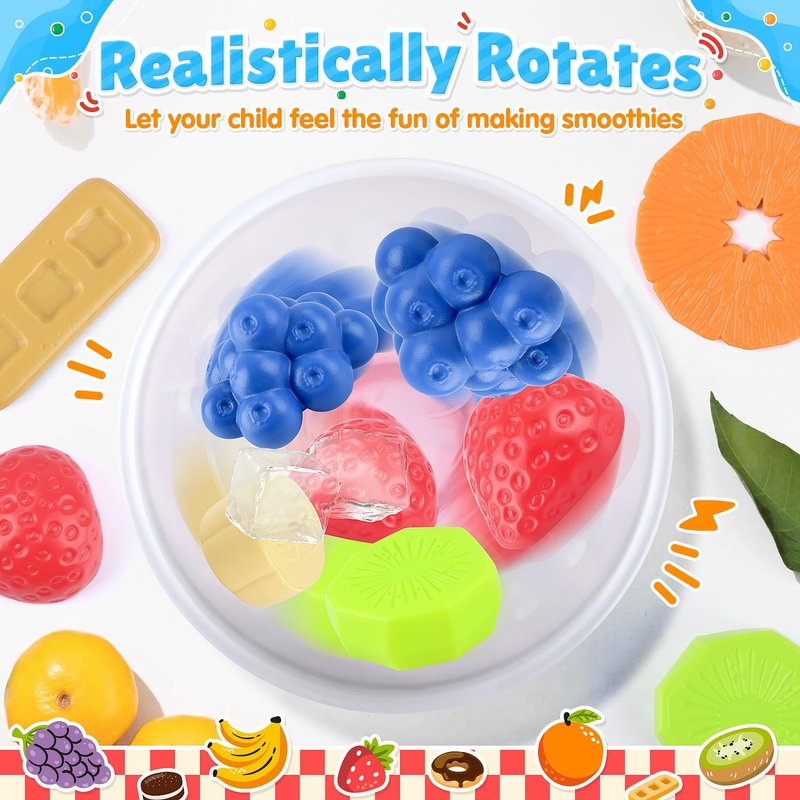 - Simple and realistic operation, multiple combinations: To make delicious fruit smoothies, just open the lid, follow the recipe on our menu card, add your favorite fruits (bananas, kiwis, grapes, oranges, strawberries) to the toy mixer, gently press the on/off button, and the colorful food and fruits will rotate with the stirring blades, and make real and powerful sounds, as if you are using a real blender! Children can also freely match and give full play to their imagination, allowing children to enjoy endless creative fun!