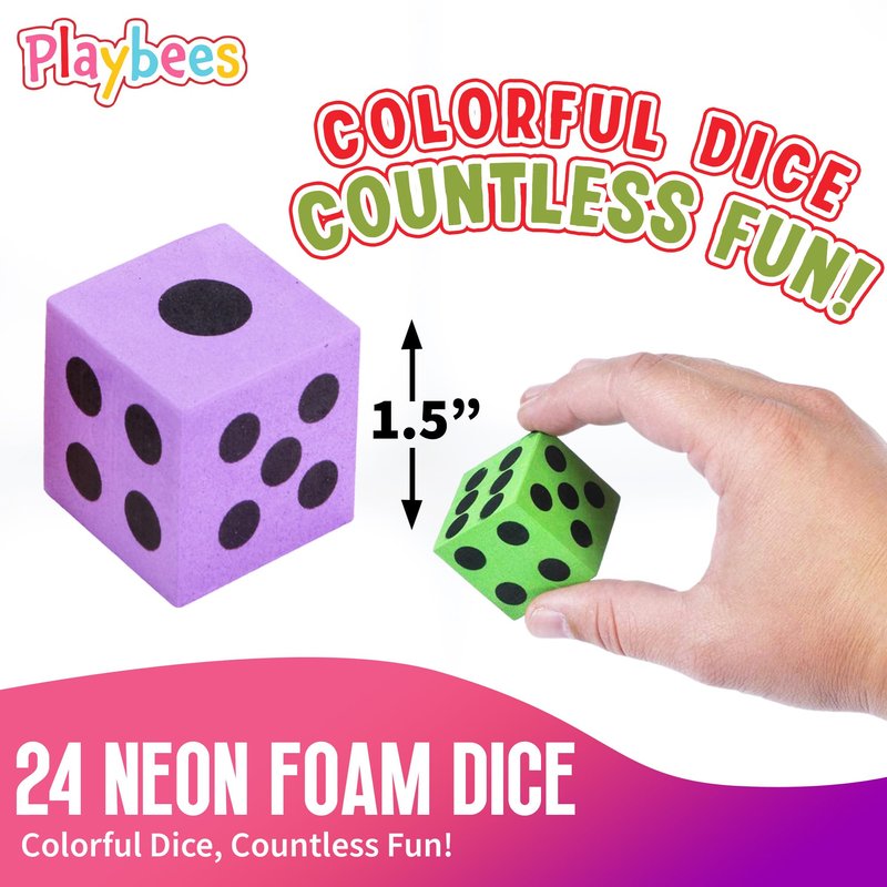 - 🎲 FOAM DICE ENCHANTMENT - Dive into the captivating world of Playbees' Large-sided Neon Foam Dice Set. Featuring 24 jumbo-sized cubes adorned with 1 to 6 black dots on each side, these enchanting dice are perfect for education, gaming, and creating lasting memories.