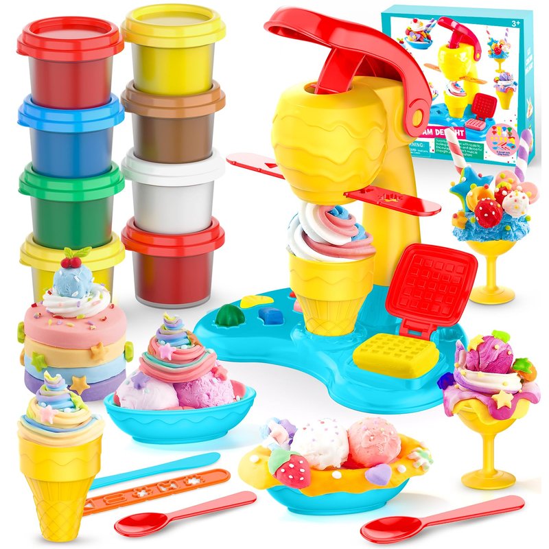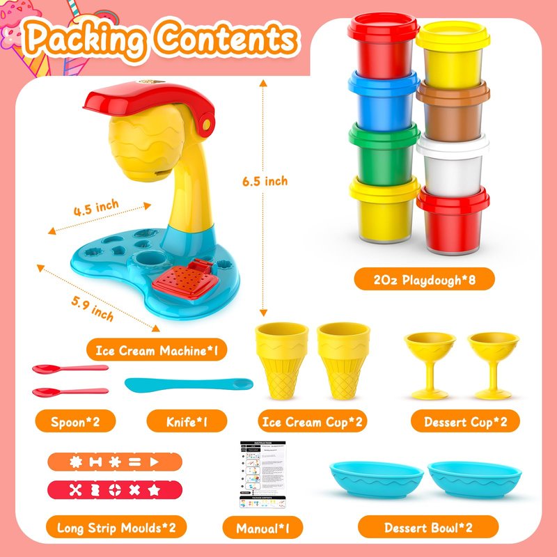 - DIY Playdough Set Toys:This ice cream maker toy set comes with eight cans colorful playdough,which have six basic color and can be blended into different colors according to the color chart on the manual, kids can make all kinds of ice cream as they like, package includes everything they need to enjoy DIY entertainment