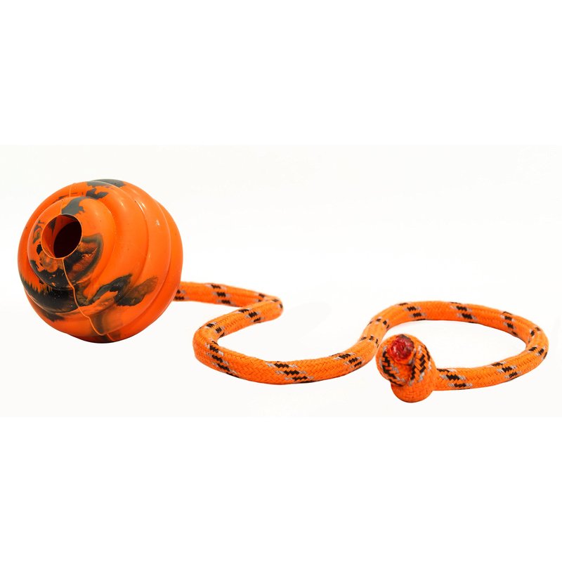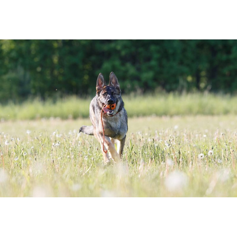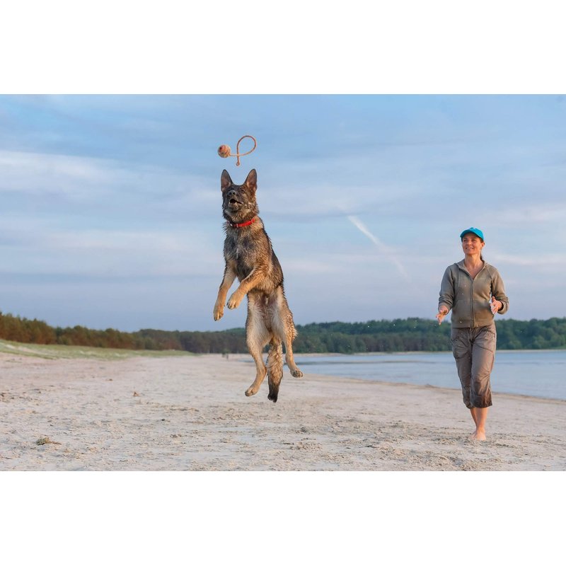 This plaything is an awesome way to exercise canines with enormous energy. Firmly attached rope allows to throw the ball for a long distance, semi-hard rubber gives nice bounce to the ball on landing and makes it easy to grab. You do not even need to have a good pitching arm. Everyone can do it.