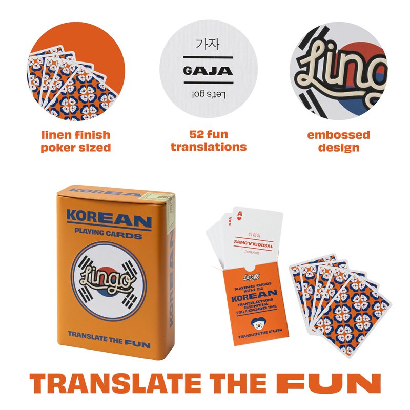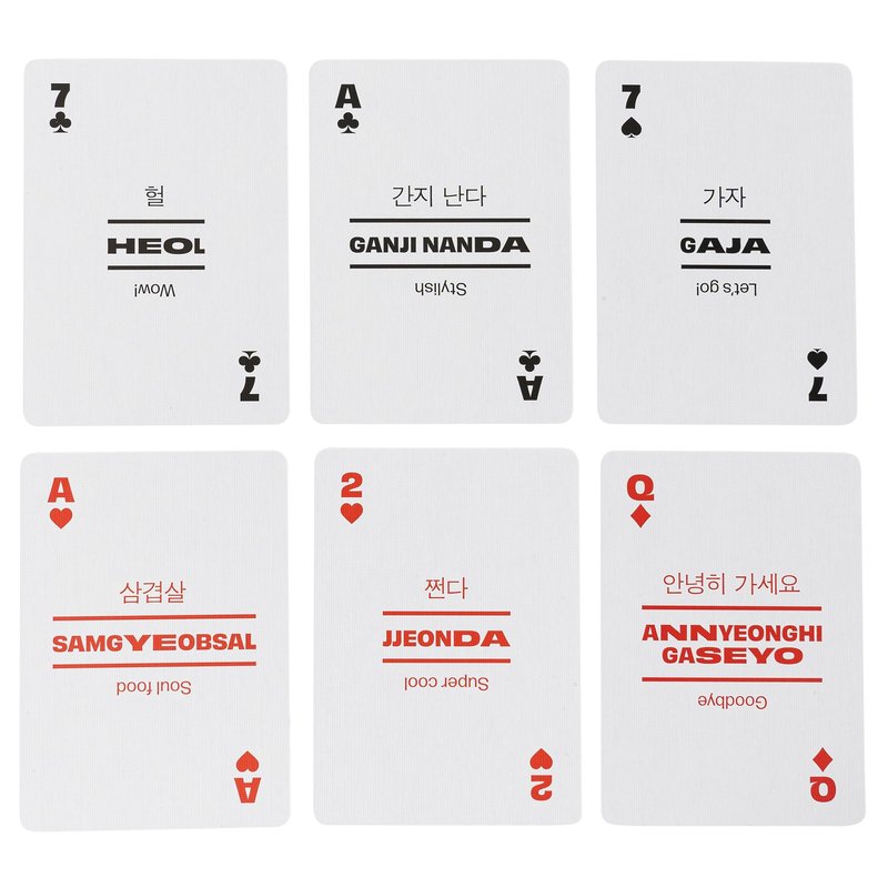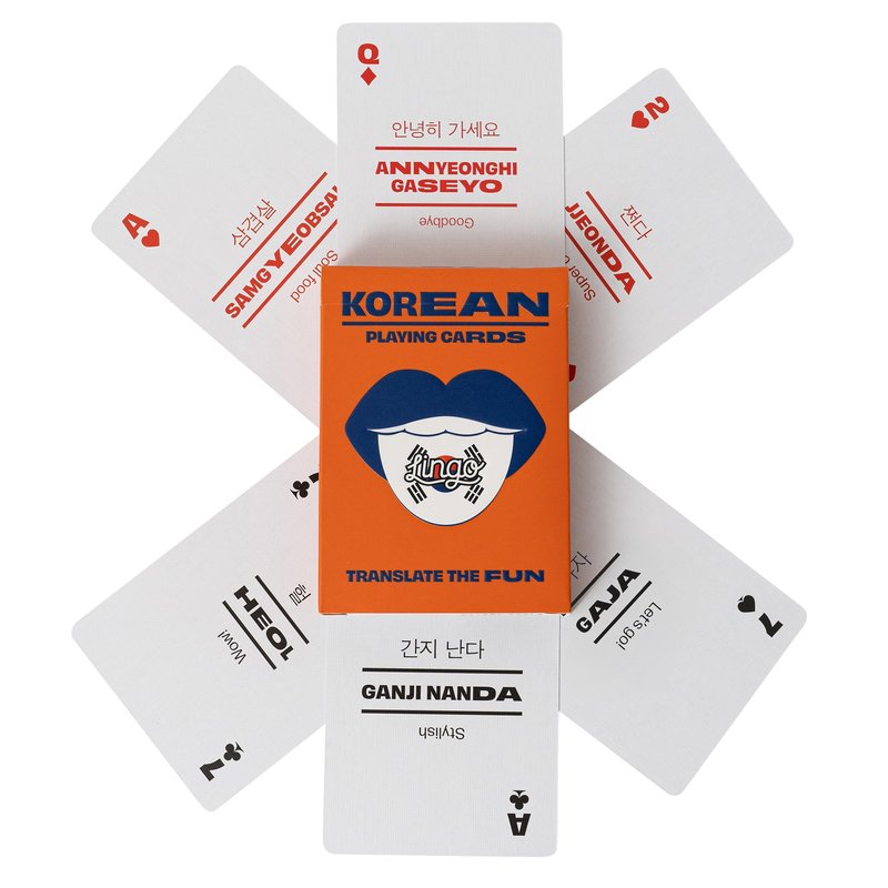 - COOL LANGUAGE LEARNING METHOD - Let the spirit of 한국 (Korea) ignite your curiosity and bring you closer to the heart of this fascinating country. Discover the magic of the Korean language and embrace a culture that blends tradition and modernity seamlessly. Lingo playing card decks come in most of the popular languages such as: Irish, Jamaican, Persian, Mandarin, Spanish, Italian, German, Japanese. Learn a language with unique playing cards!