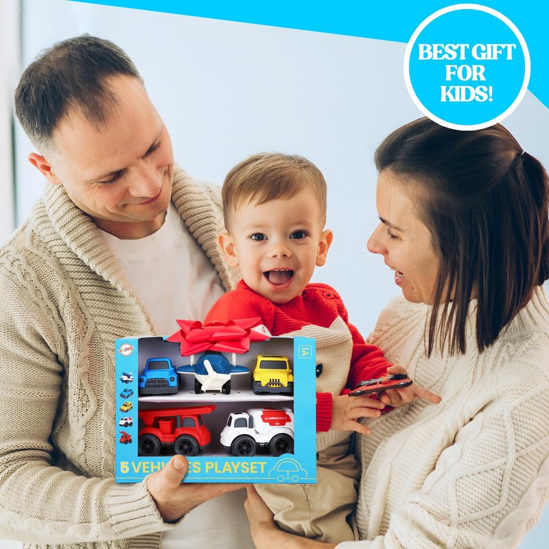 - Exciting Toy Vehicle Playset; This set of toy cars for toddlers includes a diverse selection of 5 vehicles—a vibrant airplane, fire truck, ambulance, pick-up truck, and jeep, providing Hours of fun and imaginative play for your toddler