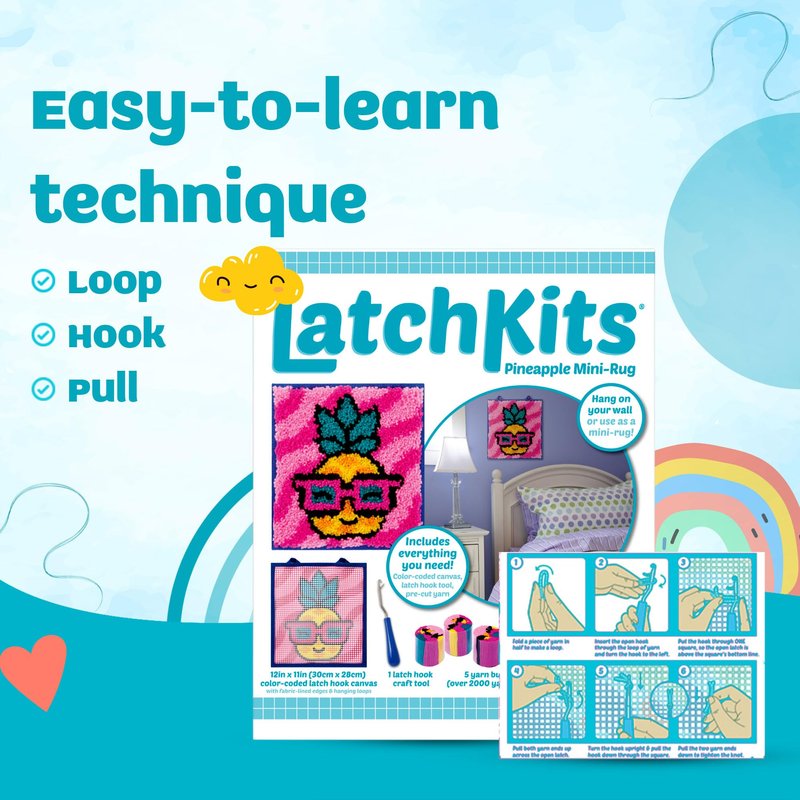 - Everything included in the kit: With over 2000 pre-cut yarn pieces, a specialized latch hook tool, and a user-friendly canvas, these latch hook kits for kids come fully equipped with all the essentials. It's a complete package offering endless creative possibilities.