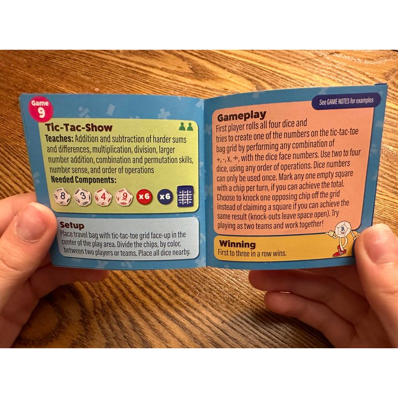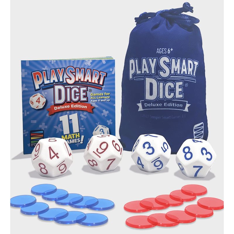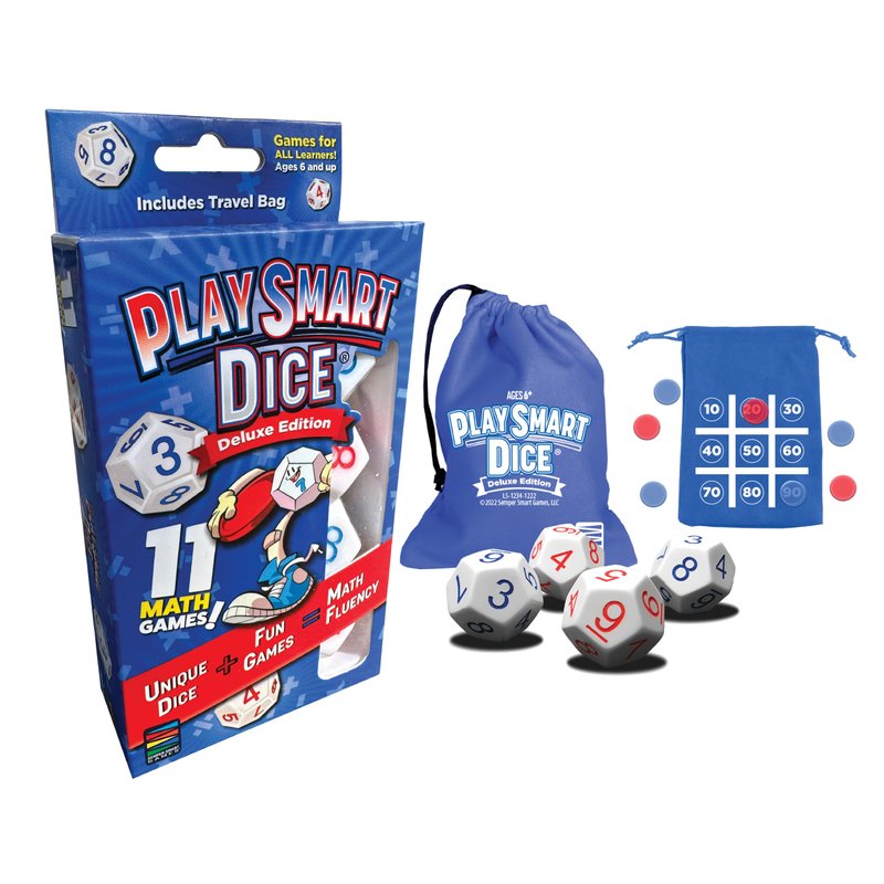- Includes 4 patent pending PlaySmart Dice, 1 travel bag, rule book with 11 math games and 20 chips