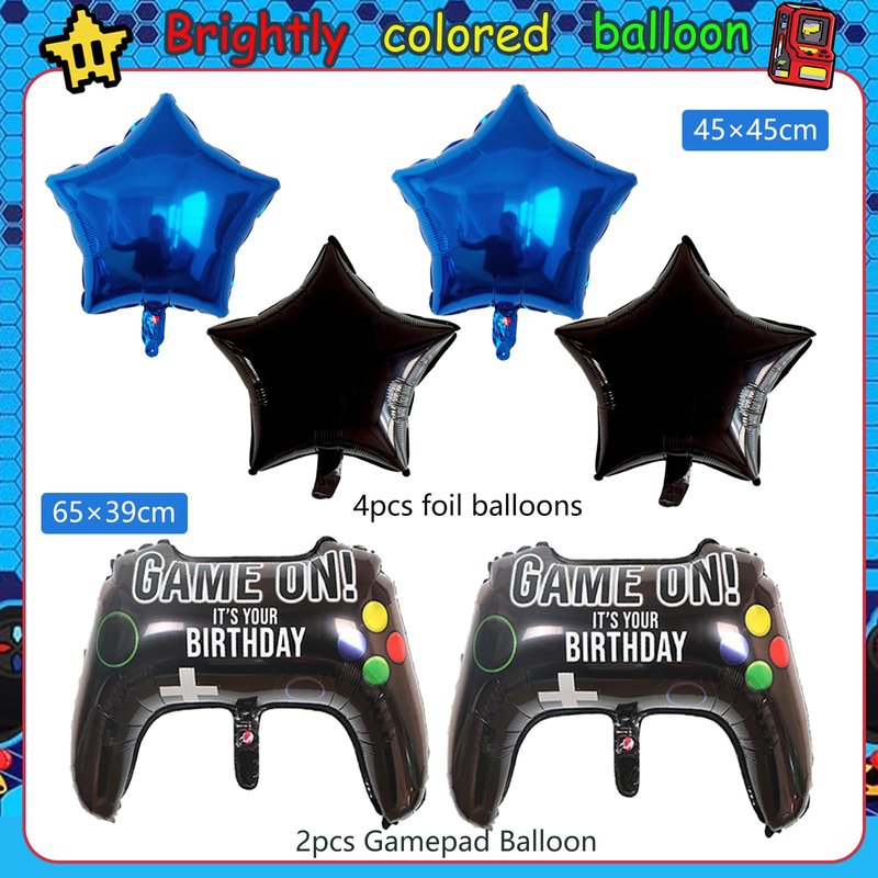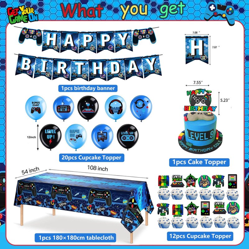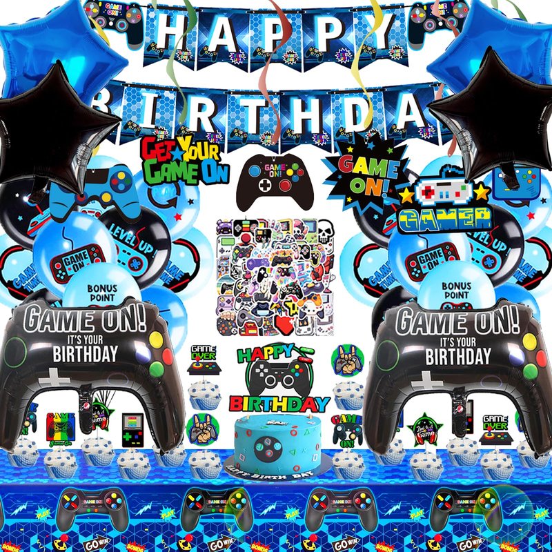 - Package Include: Our party combination includes 1pcs HAPPY BIRTHDAY banner,18pcs latex balloons with different patterns,2pcs blue foil star balloons,2pcs black foil star balloons,2pcs game foil balloons,1pcs hanging swirls,12pcs cupcake toppers,1pcs cake topper,1pcs table cover,1pack stickers with 50pcs.Super Valued.
