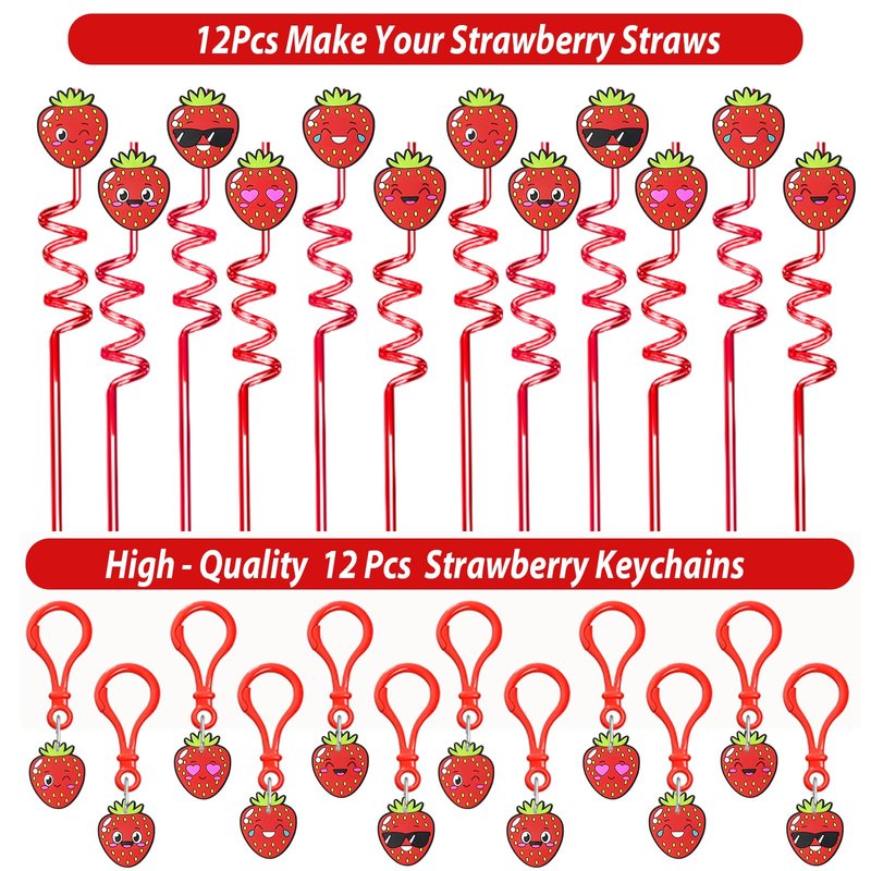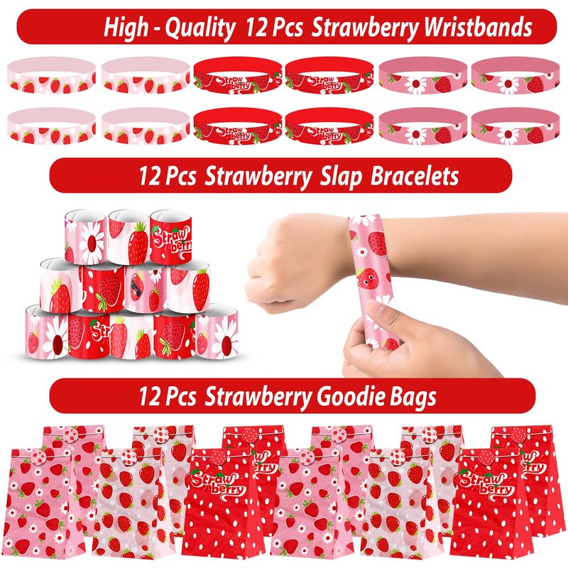 Make your Strawberry-themed party a roaring success with our all-in-one Strawberry Party Favors, This comprehensive set includes 208pieces of pure excitement: from 12 Strawberry treat bags to 12 fun Crazy Straws and 12 Bubble Wands with Strawberry charms. Kids will love the variety of goodies stickers, trendy Slap Bracelets, and adorable Keychains. The package also features essentials like Temporary Tattoos, Cake Toppers, Thank You cards, and more. Ideal for birthdays, classroom rewards, or any Strawberry-themed celebration, these party favors guarantee non-stop fun. Save time and money with this ultimate-party solution that caters to all your needs in one convenient package. Whether you're filling pinatas or delighting guests with themed giveaways, our Strawberry Birthday Party Supplies are sure to build unforgettable memories.