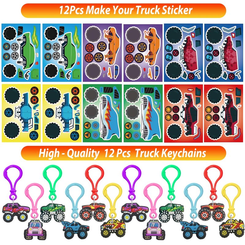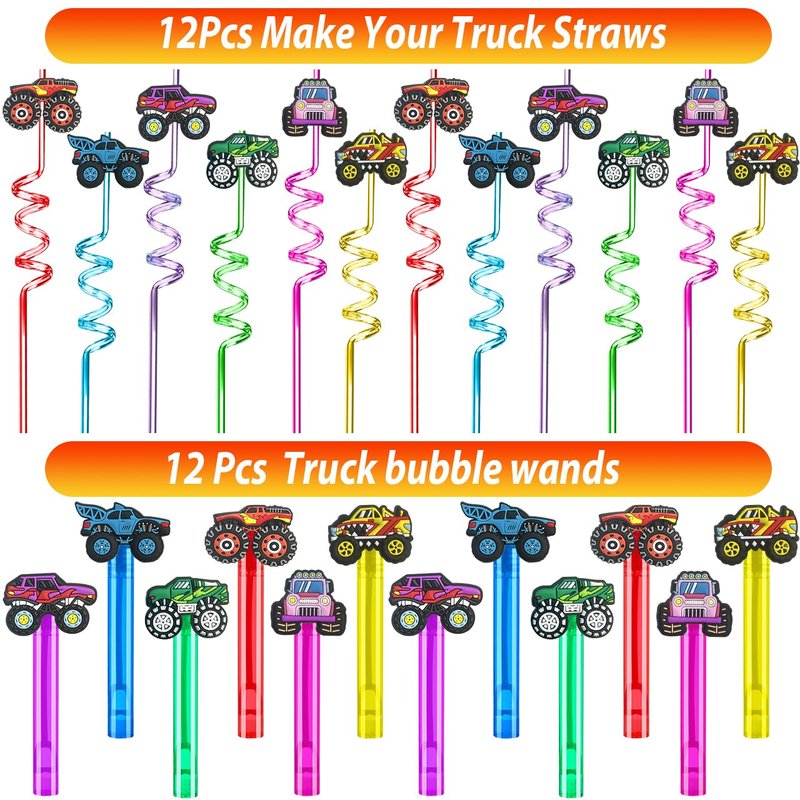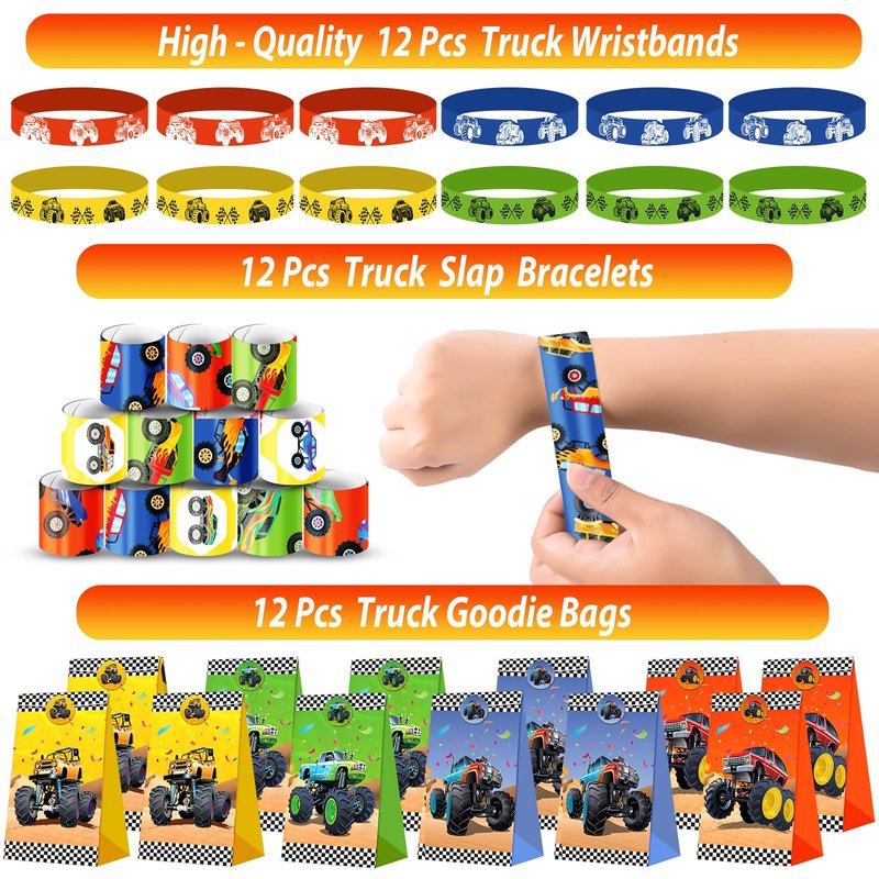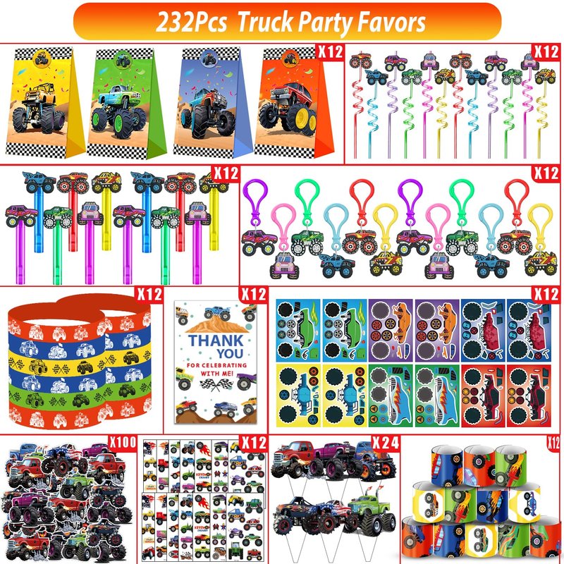 - Perfect Monster Truck Birthday Decorations: Monster Truck party with this set featuring 12 Crazy Straws, 12 Charm Bubble Wands, 12 Mace a Face Stickers, 12 Treat Bags, 12 Wristbands, 12 Keychains, 12 Slap Bracelets, 12 Thank You Cards, 24 cake toppers and 100 Stickers, all adorned with the iconic Monster Truck theme.