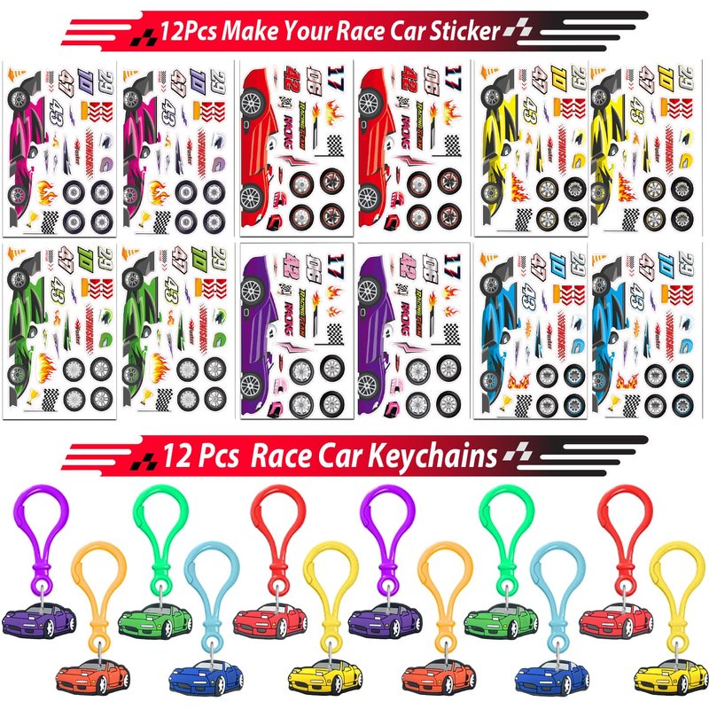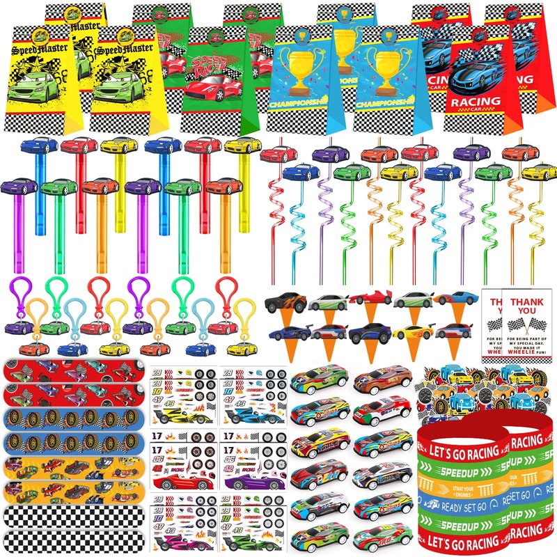 - Ultimate Race Car Party Favors: Race Car Party Bags are great for favors, Race Car Crazy Straw for Sipping Fun. Add excitement with the Race Car Bubble Wand. The Bracelet and Keychain add fun to the party. Slap Bracelets and the DIY Stickers add party flair. also added Temporary Tattoos Cake toppers Thank You cards etc. This affordable Race Car Party Set has it all. Ultimate Race Car Theme Party Favors